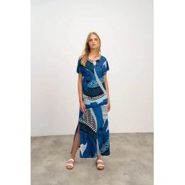 Elegancka długa wzorzysta sukienka damska z krótkim rękawem, okrągłym dekoltem i ozdobną klamrą, czyli wszystko, czego kobieta potrzebuje w gorące letnie dni. Sukienka wykonana jest z wysokiej jakości dżersejowej wiskozy z dodatkiem elastanu. Jersey Viscose charakteryzuje się wysoką chłonnością, jest dobrze oddychający, miękki i przyjemny w dotyku, a elastan gwarantuje lepszą elastyczność tkaniny.