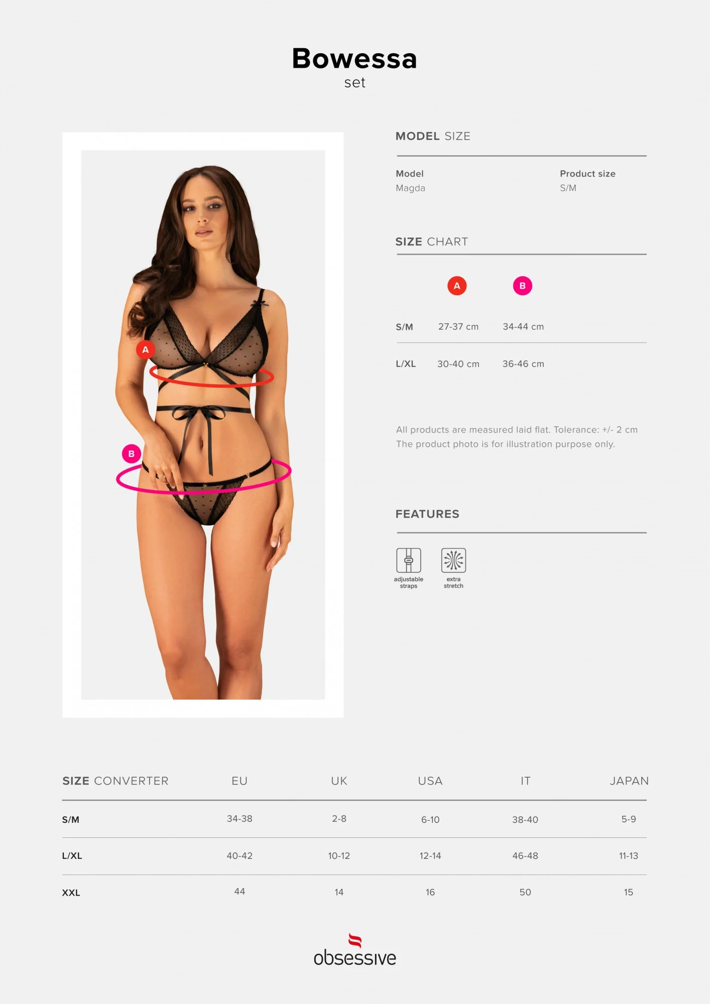 Zestaw twoich marzeń? Taki, który sprawi, że będziesz wyglądać jak prawdziwa bogini. Co powiesz na elegancki, lekko prześwitujący czarny materiał ozdobiony uroczymi kropkami? Eleganckie kokardki sprawią, że będziesz chciała założyć zestaw Bowessa już dziś.