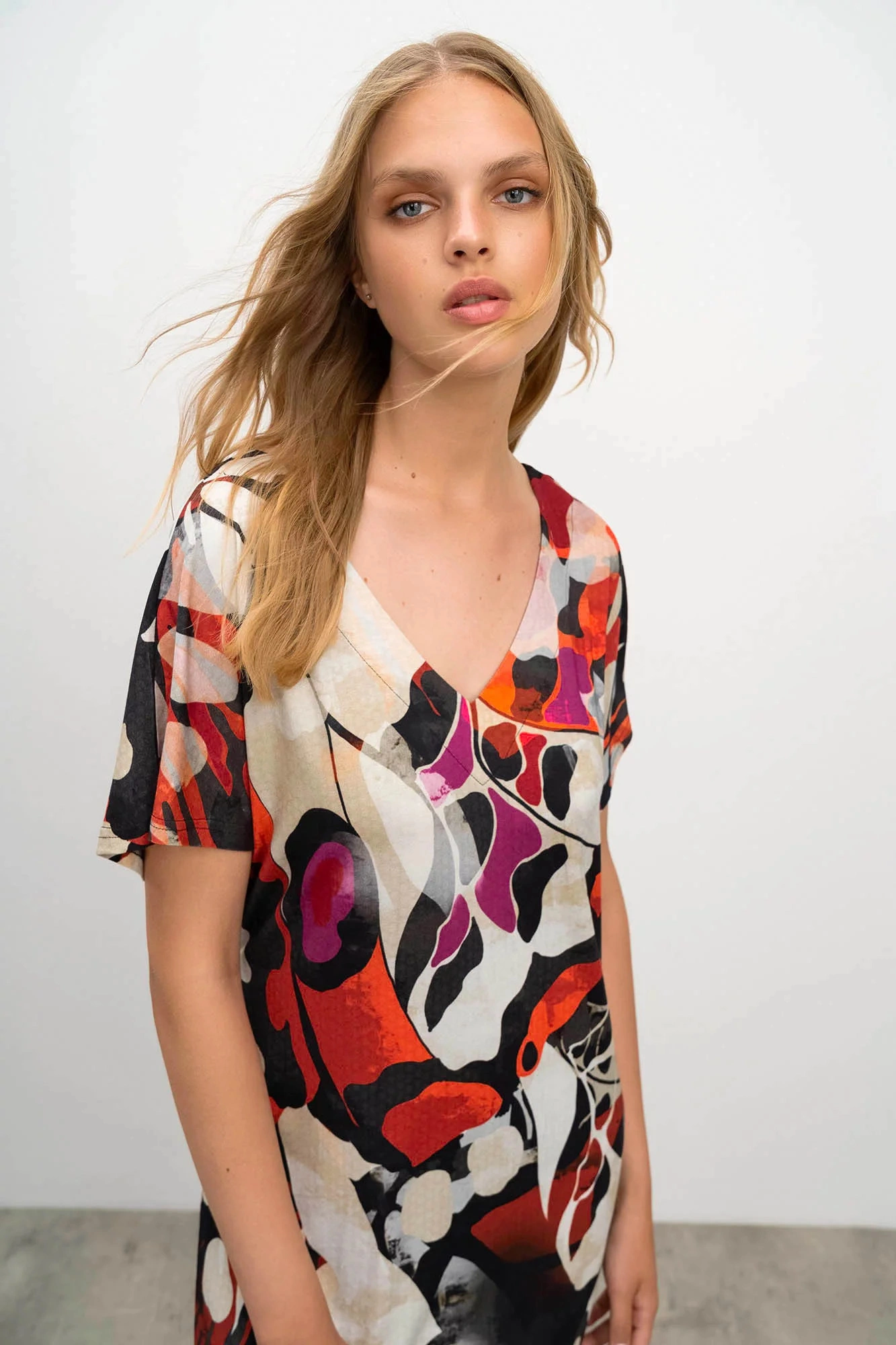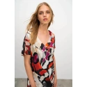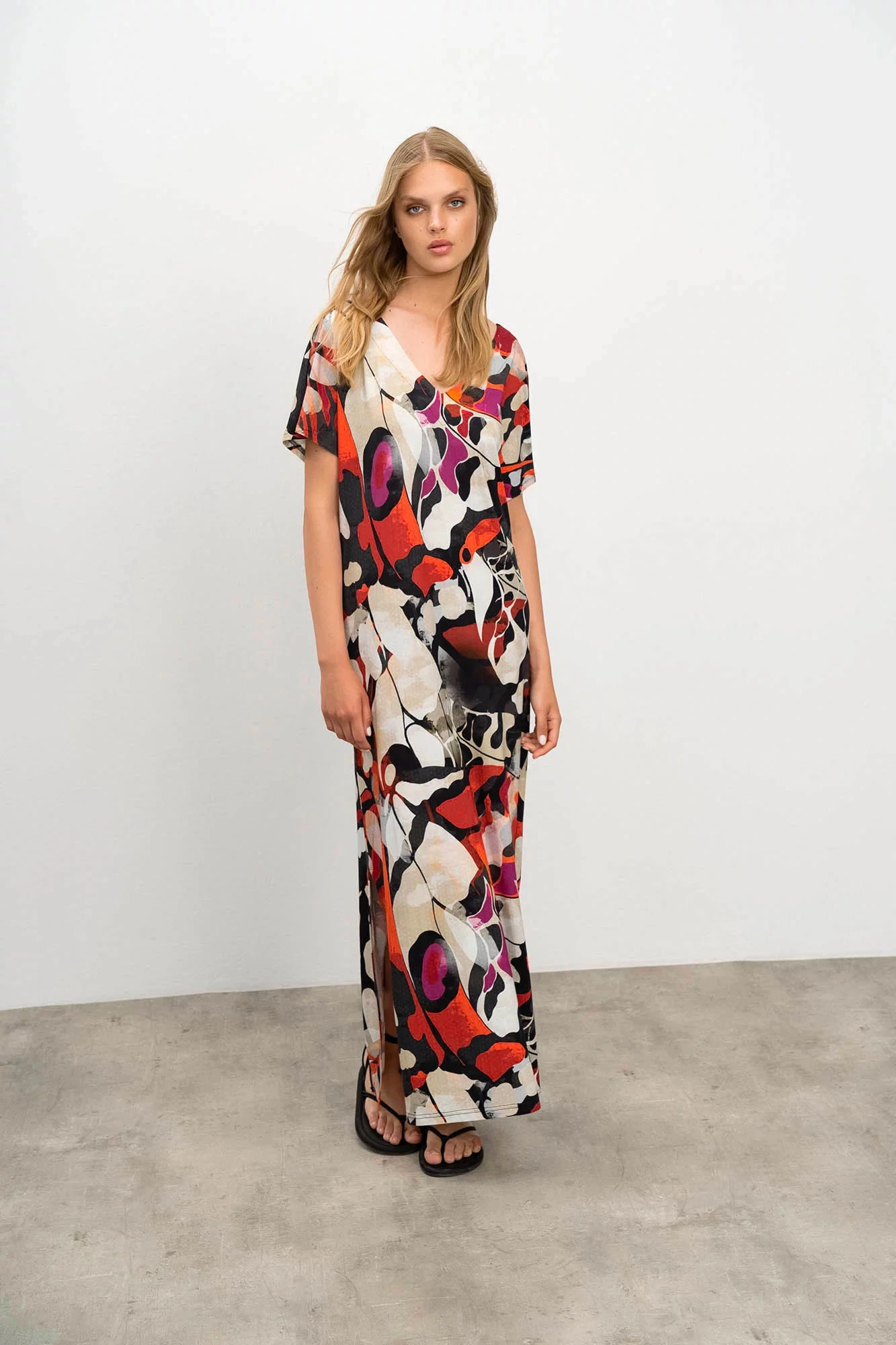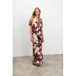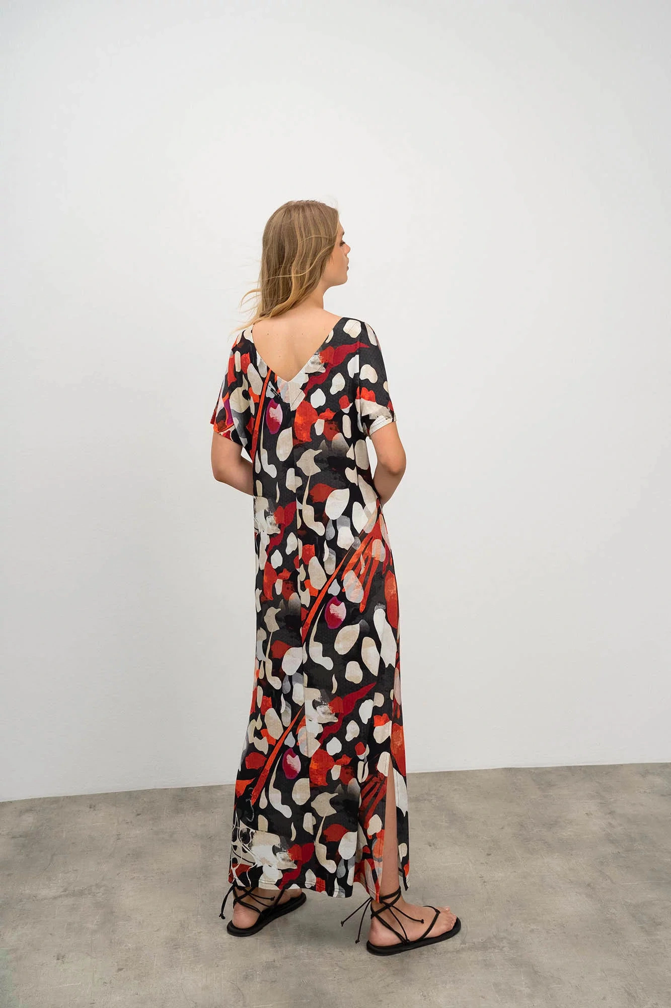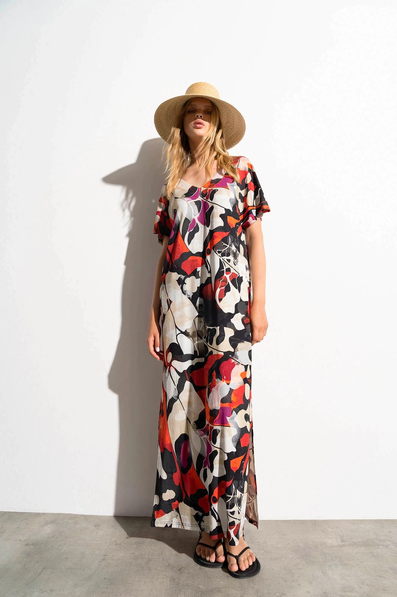 Elegantní dlouhé vzorované dámské šaty s výstřihem do V a krátkým rukávem, vše co žena v parných letních dnech potřebuje. Šaty jsou vyrobené z kvalitní jersey viskózy s příměsí elastanu. Jersey Viscoza se vyznačuje vysokou savostí, je dobře prodyšná, měkká a příjemná na dotek a elastan zaručuje lepší pružnost tkaniny.