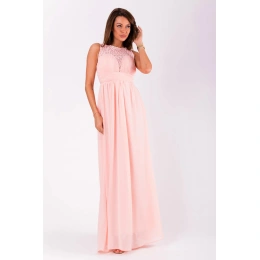 Damska sukienka wieczorowa. Ten model ma krój gorsetowy. Ten krój jest uzupełniony u góry koronką w tym samym kolorze co sukienka. Koronka uzupełnia krój sukienki, która jest bez rękawów z okrągłym dekoltem, prawie do szyi. Zapięcie tego modelu znajduje się z tyłu za pomocą wszytego zamka błyskawicznego, który jest bardzo niepozorny. Noś tę sukienkę na imprezy towarzyskie, takie jak studniówki, wizyty w teatrze lub wydarzenia o podobnym charakterze, a poczujesz się świetnie. Materiał, z którego wykonano sukienkę jest przyjemny w dotyku.
