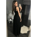 Długa, zwiewna sukienka bez rękawów w kolorze czarnym. Dekolt ozdobiony jasnymi zdobieniami. Idealna na wiele okazji.