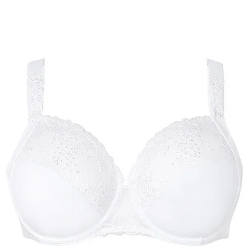 Biustonosz na fiszbinach z pełną miseczką wykonany z dzianiny i haftu.Wyprofilowane miseczki w dolnej części dla optymalnego wsparcia i większego komfortu.Trzyczęściowa konstrukcja miseczki zapewnia zakrzywiony kształt.Haftowane górne części miseczek z fiszbinami.Dolna część miseczek jest podszyta bawełną dla dodatkowego komfortu, a boki miseczek są wzmocnione nieprzezroczystą dzianiną dla dodatkowego wsparcia. Haftowany przód z obszytym brzegiem, podszyty sztywnym tiulem. Baletowe plecy z elastycznej dzianiny dla optymalnego wsparcia.Regulowane ramiączka z gipiurowymi akcentami.