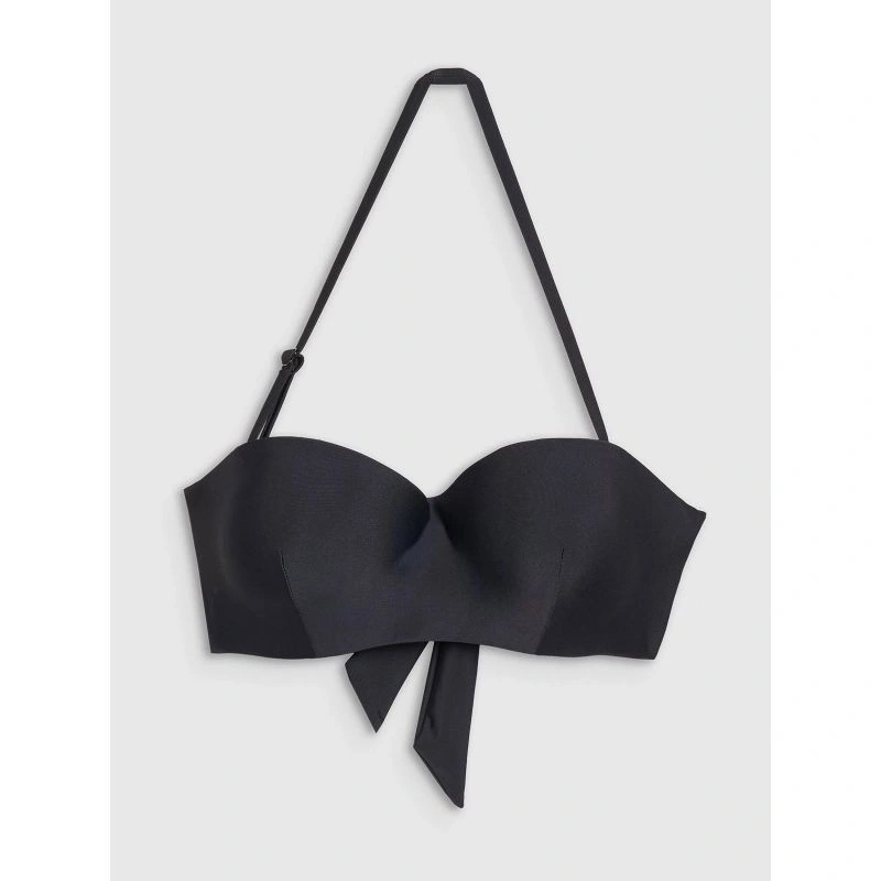 Model posiada profilowane, usztywniane miseczki (bez dodatkowych wkładek), które nadają piersiom naturalny kształt. Krój bardotki z nisko wyciętymi miseczkami subtelnie podkreśla dekolt, a wiązanie na plecach pozwala na dokładne dopasowanie obwodu. Odpinane, cienkie ramiączka z regulacją umożliwiają noszenie topu na różne sposoby – z ramiączkami lub bez.
