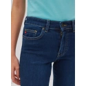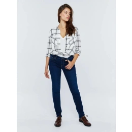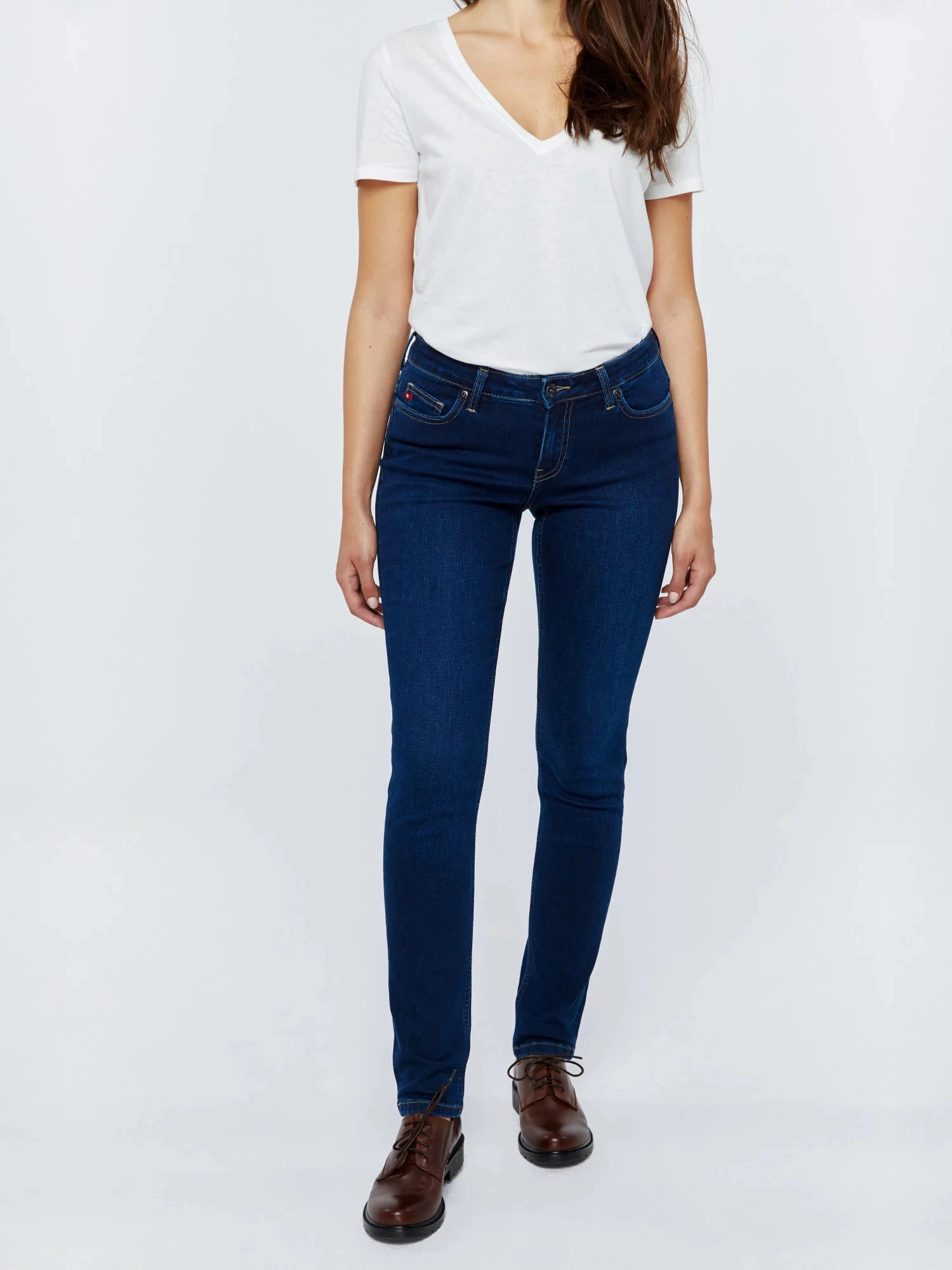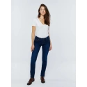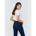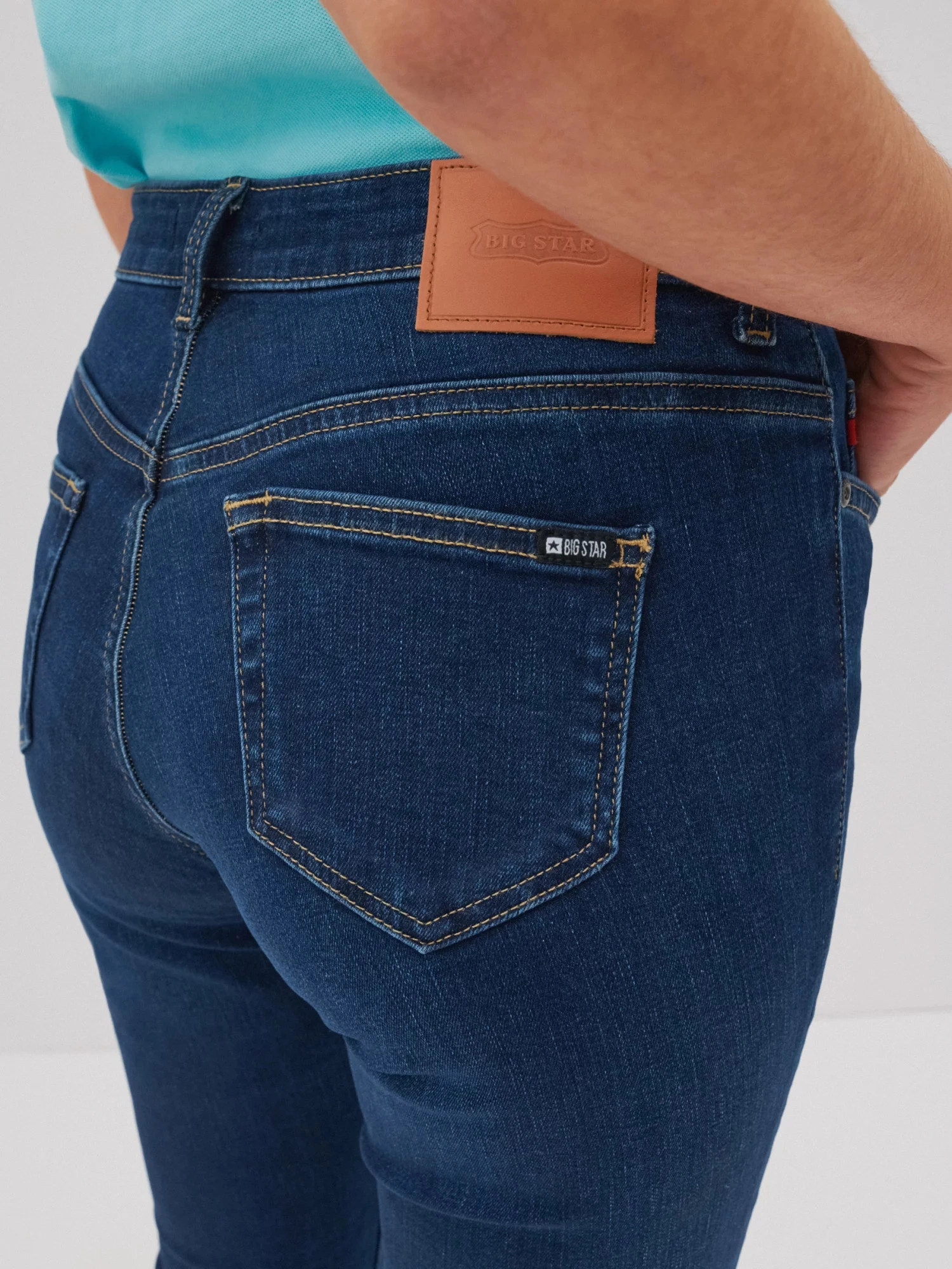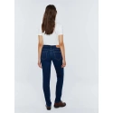 modny krój podkreślający sylwetkę wysoka talia, zwężane nogawki, pięć kieszeni, szlufki na pasek, markowa aplikacja z tyłu dopasowany krój, regularne dopasowanie w talii