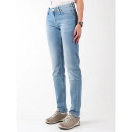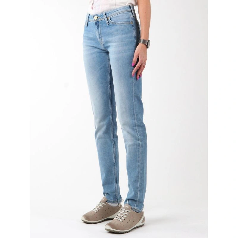 Damskie jeansy z wąskimi nogawkami. Kieszonki z przodu i z tyłu. Na pasku z tyłu skórzana wstawka z logo firmy Lee.