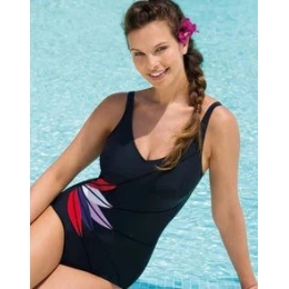 jednoczęściowy kostium kąpielowy Tassia w kolorze czarnym z kolorowymi liśćmi z przodu. Podszewka Anita i fiszbiny zapewniają dobre podtrzymanie biustu i komfort noszenia. Ramiączka można regulować. Materiał: 80% poliamid, 20% elastan
