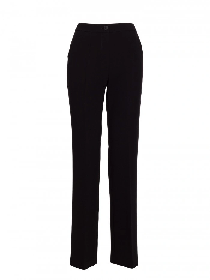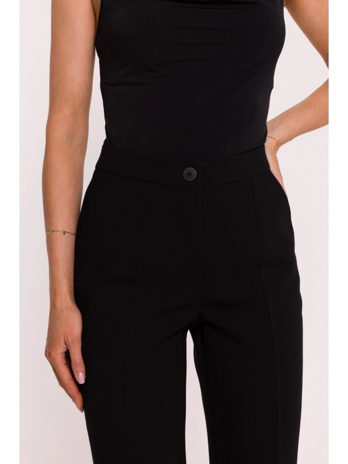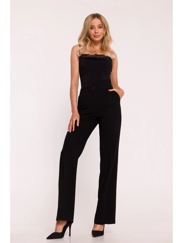 63% polyester 33% wiskoza 4% elastan LÁTKA Tkanina: hladká tkanina s měkkým povrchem PODROBNOSTI O PRODUKTU Pas: střední výška Zapínání: knoflík vpředu a skrytý zip Kapsy: boční kapsy Nohavice: dlouhé, rovné, s řasením Podšívka: žádná Model: S418 Navrženo a vyrobeno v Polsku Modelka je vysoká 174 cm a nosí velikost S STYL A STŘIH Styl: klasické kalhoty na míru Tvar: vypasované v pase a na bocích, rovné nohavice Délka: po celé délce, až na zem