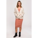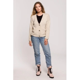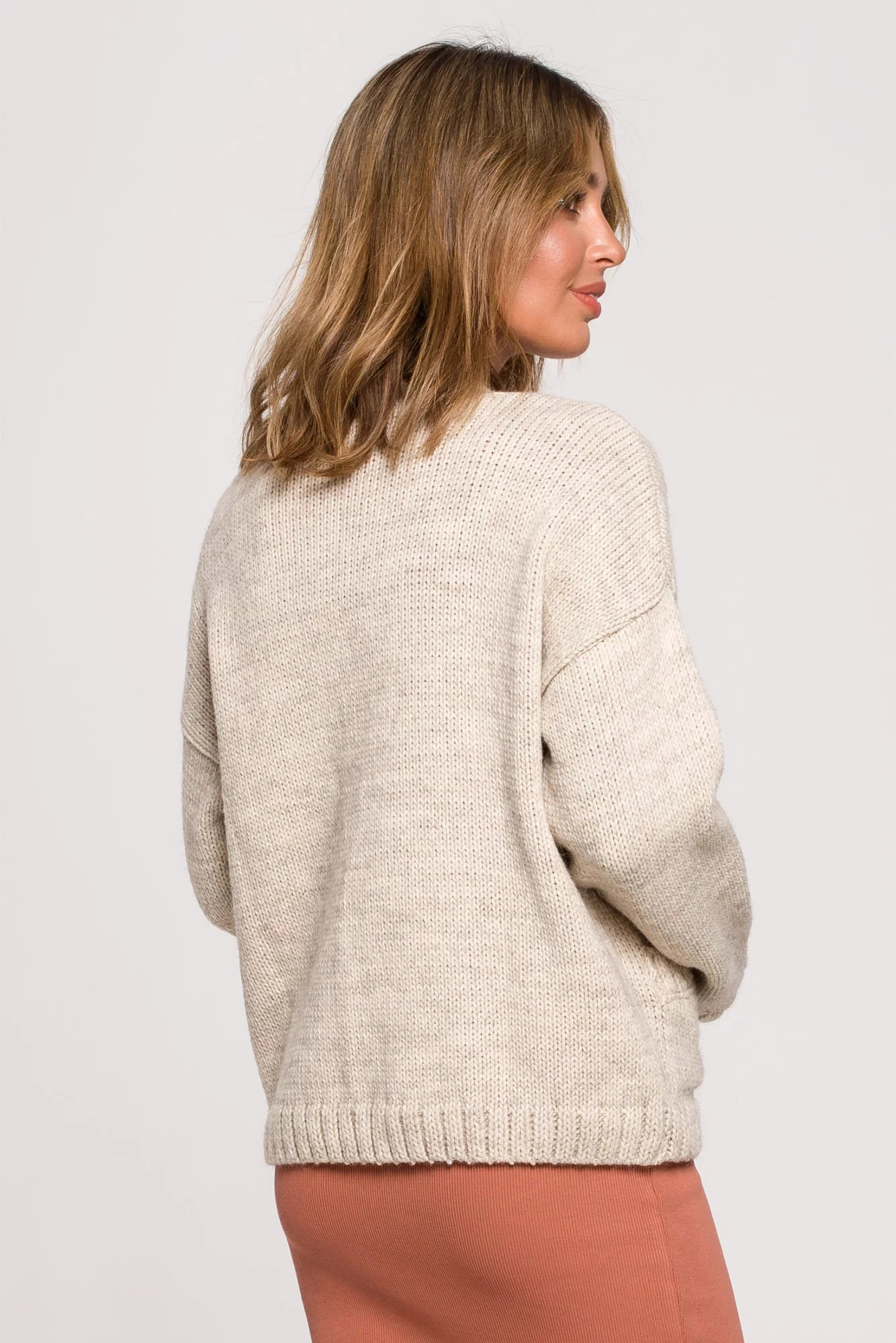 Ten przycięty sweter z grubej dzianiny z dużymi kieszeniami, zapięciem na guziki i pochlebnym dekoltem w kształcie litery V stworzy wiele ciekawych stylizacji.