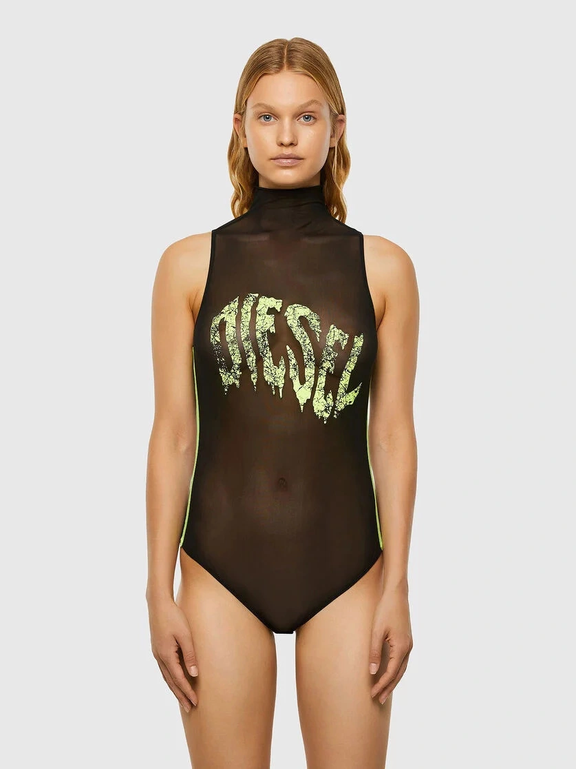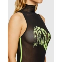 Body bez rękawów wykonane z miękkiej, elastycznej siateczki, z kołnierzykiem golfowym. Z przodu nadrukowano kapiące logo Diesel w jasnozielonym kolorze.