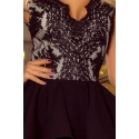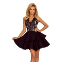 Piękna damska sukienka odpowiednia na imprezy towarzyskie. Model sukienki bez rękawów z dekoltem w kształcie litery V, który pięknie podkreśla dekolt. Górna część sukienki jest ozdobiona delikatną koronką i dodaje jej romantycznego charakteru. Bogata podwójna spódnica również przyciągnie uwagę. Długość sukienki sięga powyżej kolan. Jeśli wybierasz się na imprezę towarzyską, na której chcesz być księżniczką, ten model jest zdecydowanym faworytem. Zakładaj je na imprezy towarzyskie, takie jak bale, wesela lub oficjalne uroczystości, a będziesz w centrum uwagi.