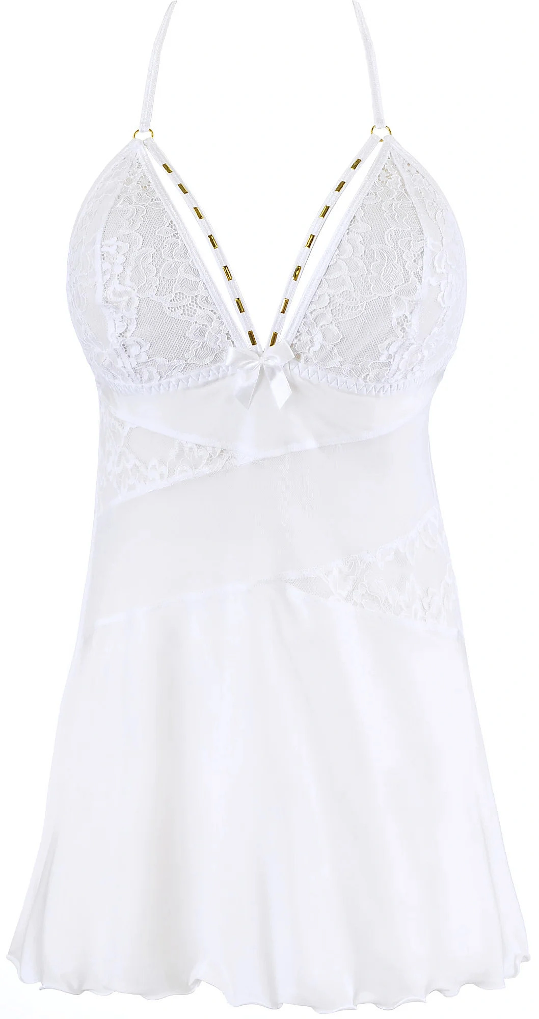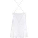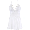 Objevte svou svobodu v naší efektní, bílé babydoll s bohatě zdobenými proužky na dekoltu.