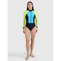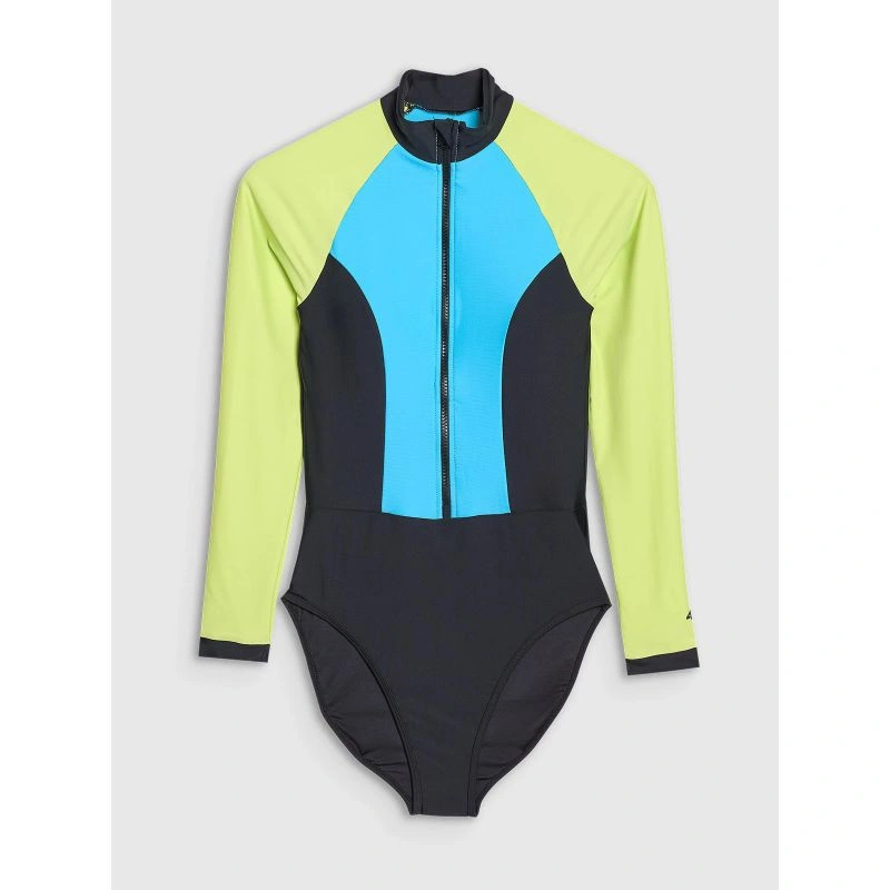 Zabudowany dekolt z suwakiem ułatwia zakładanie stroju i nadaje mu sportowego charakteru. Miseczki wyposażone są w wyjmowane wkładki, co pozwala na indywidualne dopasowanie wsparcia i kształtu. Fason ze ściąganymi raglanowymi rękawami zapewnia pełną swobodę ruchów, co jest szczególnie ważne podczas pływania.