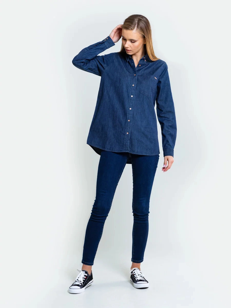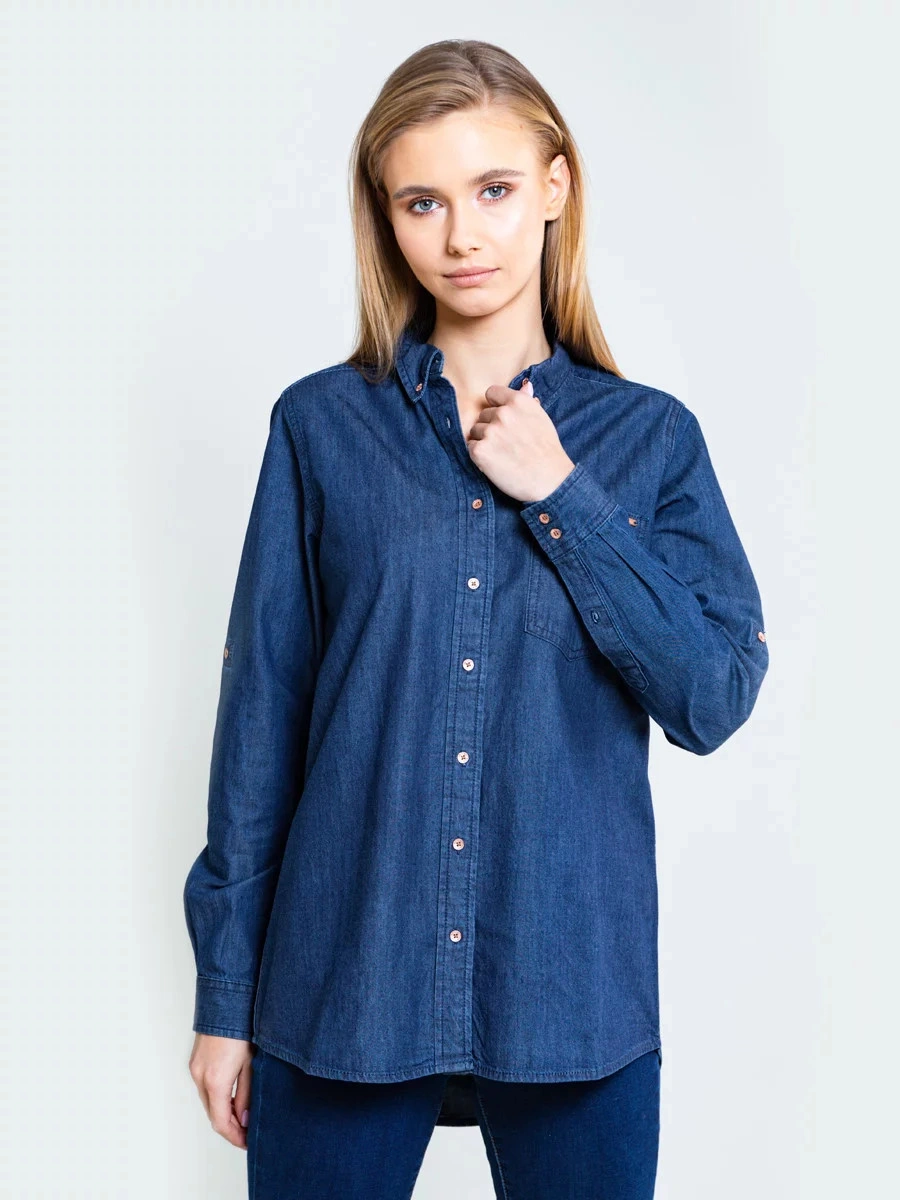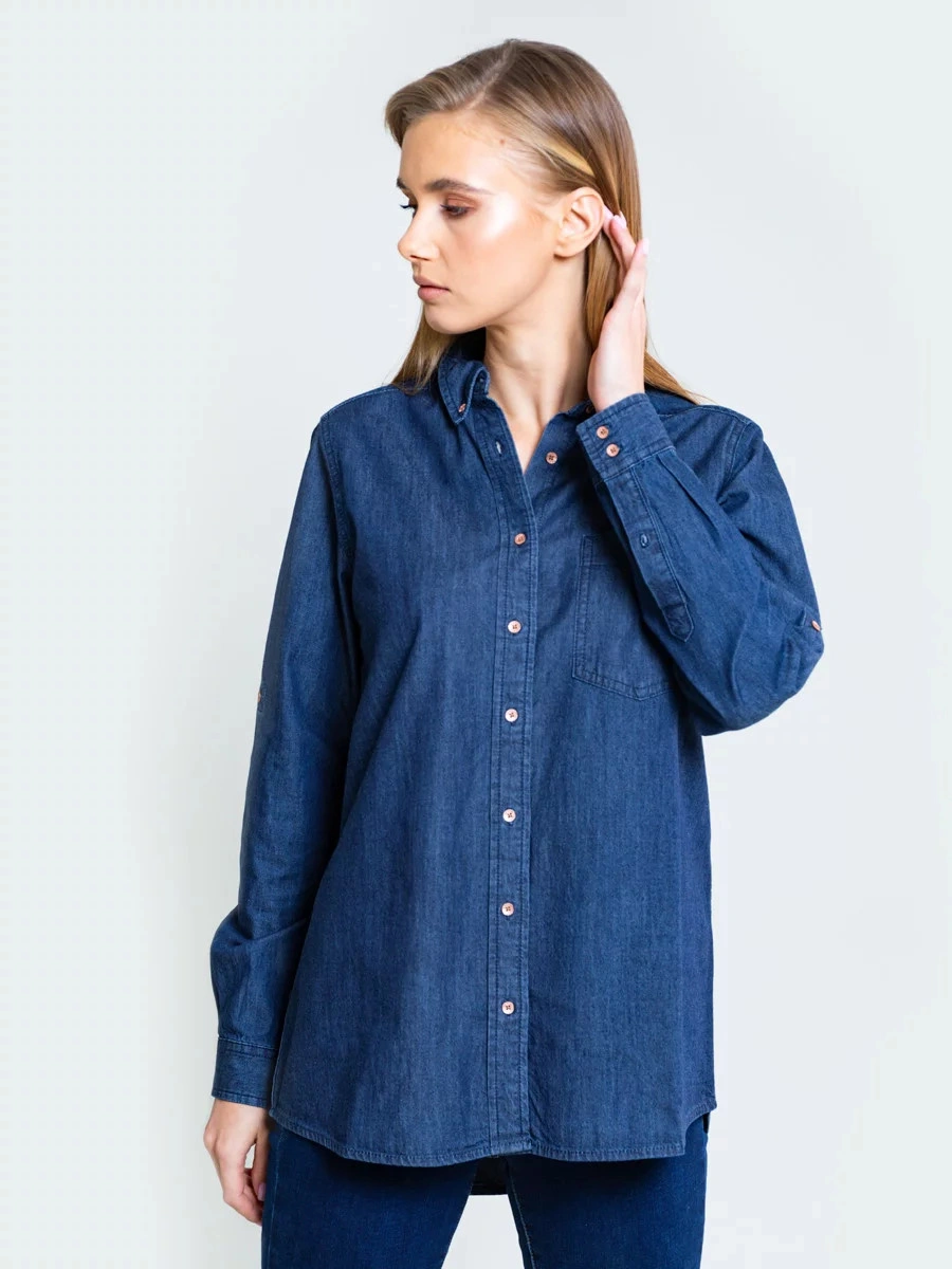 dżinsowa koszula, która nigdy nie wychodzi z mody kołnierzyk zapinany na guziki kieszeń na piersi, plisa zapinana na guziki, długie rękawy, mankiet zapinany na guziki, podwinięty dół, krój oversize