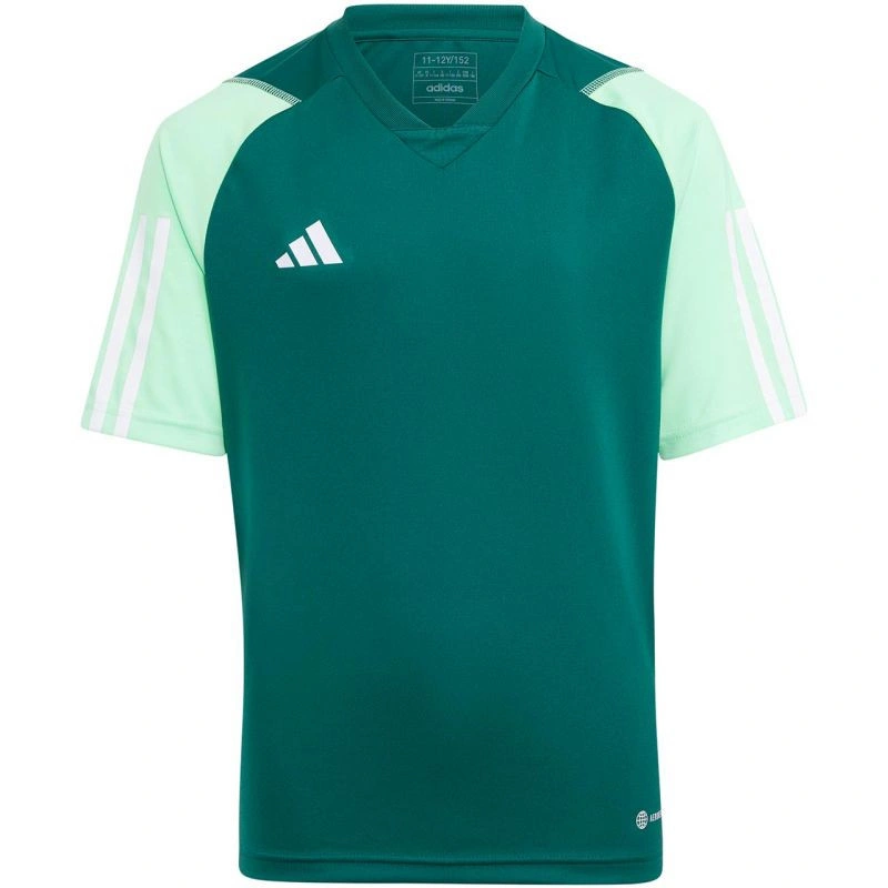 Koszulka dla dzieci adidas Tiro 23 Competition Jersey zielona HU1300 Koszulka dla dzieci adidas sprawdzi się podczas decydujących rozgrywek. Regularny krój. Trójkątny dekolt wykończony siateczkową wstawką. Boczne panele z siateczki. Technologia Aeroready oprowadza nadmiar wilgoci. Włókna powstały w procesie recyklingu. Materiał: 100% poliester z recyklingu