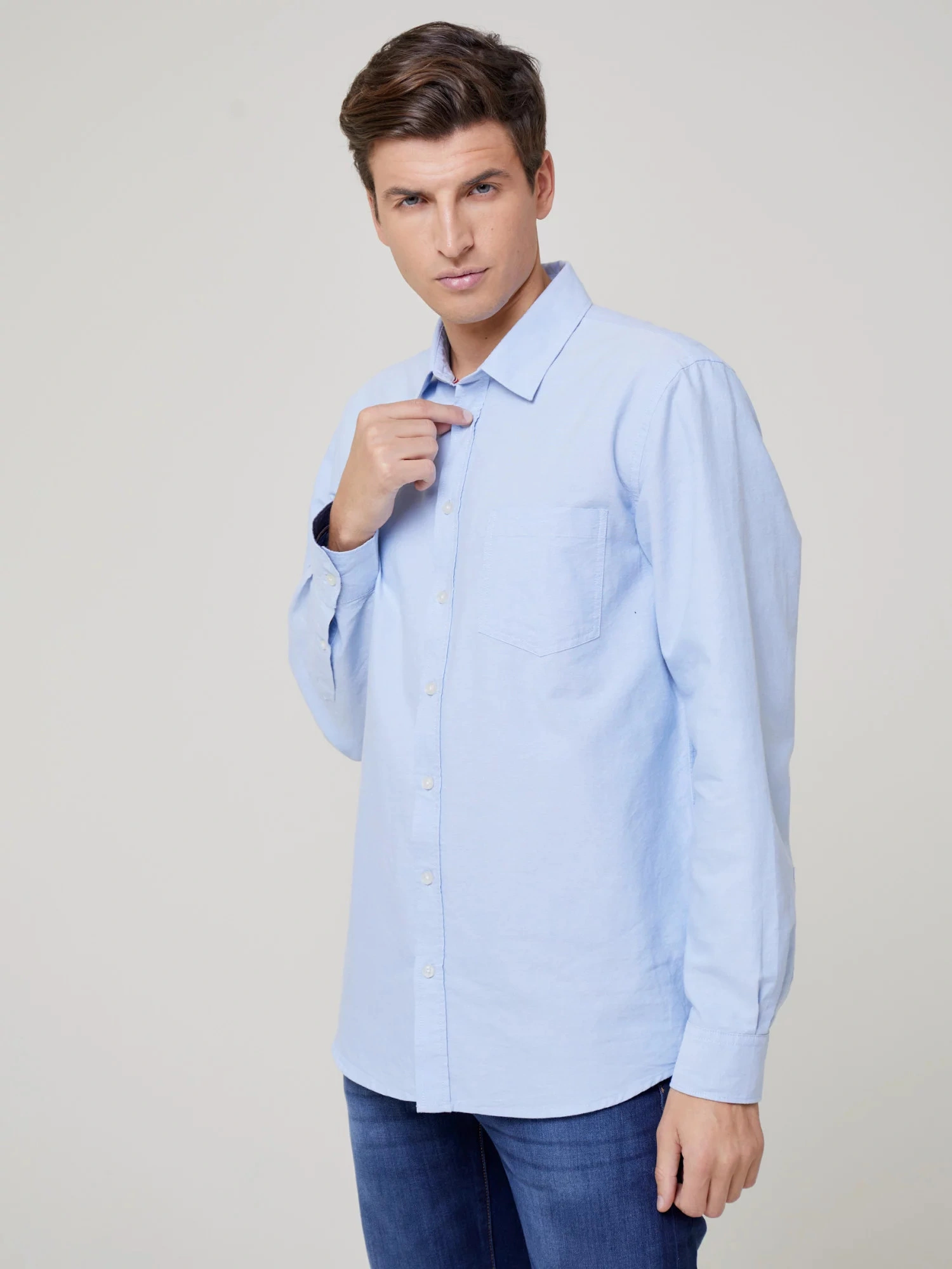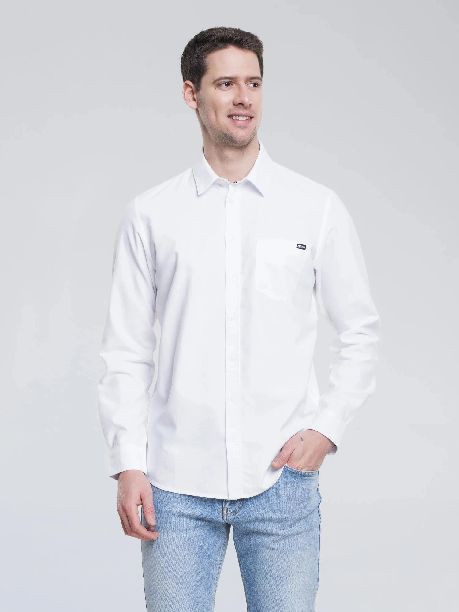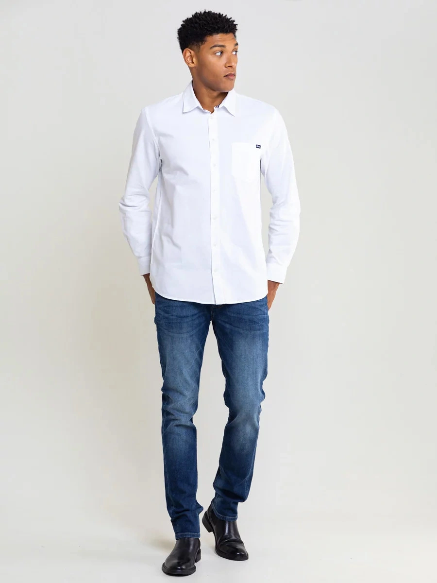 męska koszula oxford o klasycznym kroju, jednolity kolor, zapięcie na guziki, długie rękawy, mankiety zapinane na guziki, kieszeń na piersi z markową naszywką na kołnierzyku, regularny krój, wykonana z oddychającej bawełny wysokiej jakości