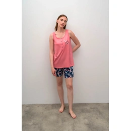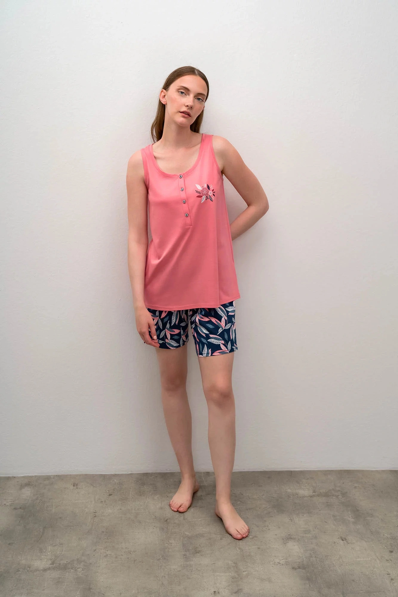 Krótka piżama damska, góra w jednolitym kolorze z nadrukiem na piersi, zapinana pod szyją, dół w kolorowe liście