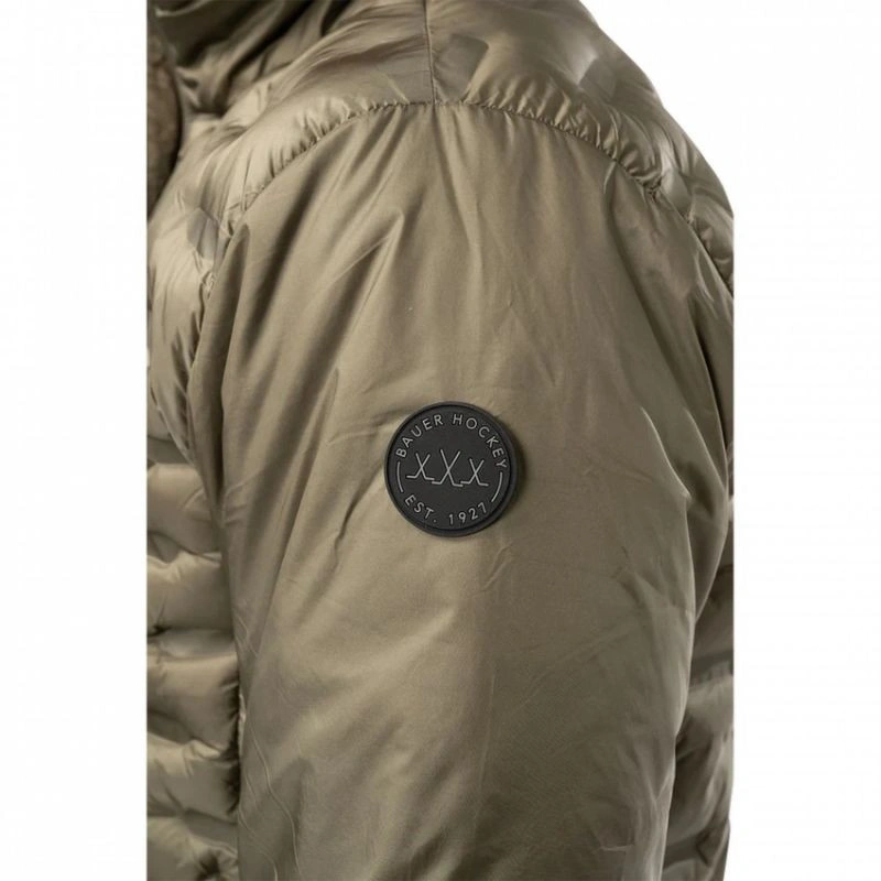 Kurtka Bauer Flc Packable Puffer Sr To lekka i składana kurtka puchowa z izolacją PrimaLoft ThermoPlume Insulation. Jest doskonała na chłodne dni, oferując znakomitą izolację cieplną i odporność na wilgoć. Dzięki możliwości składania jej w niewielką torbę lub plecak, jest niezwykle praktyczna w podróży. Kurtka posiada wysoki kołnierz, pełny zamek błyskawiczny, dwie boczne kieszenie i elastyczne mankiety. Na lewym rękawie znajduje się naszywka Bauer. Dostępna jest w kolorze oliwkowym z pikowanym wzorem. Jeśli poszukujesz lekkiej, ciepłej i stylowej kurtki puchowej, która sprawdzi się w każdej sytuacji to idealny wybór dla Ciebie. Główne cechy: Zwężany krój hokejowy Izolacja PrimaLoft® ThermoPlume® Połączone pikowane panele Zamek błyskawiczny YKK® na środku z przodu z osłoną przeciwwiatrową Elastyczny ściągacz u dołu i na rękawach Kieszenie boczne z zamkami YKK Całą kurtkę można spakować PrimaLoft® ThermoPlume® Insulation to syntetyczna ocieplina, która naśladuje właściwości i wygląd naturalnego puchu gęsiego. Jest lekka, miękka, sprężysta i dobrze izoluje ciepło. Jest też odporna na wilgoć i łatwa w pielęgnacji. PrimaLoft® ThermoPlume® Insulation jest przyjazna dla wegan i środowiska, ponieważ jest wytwarzana z 100% materiałów pochodzących z recyklingu.