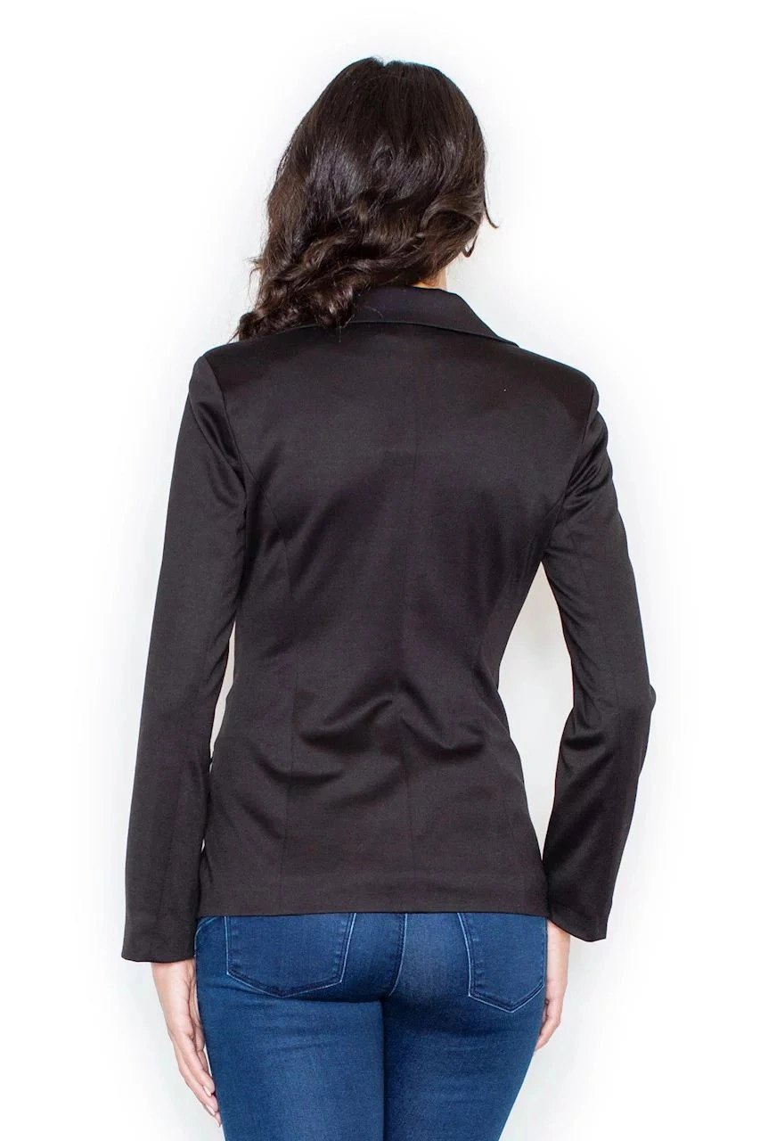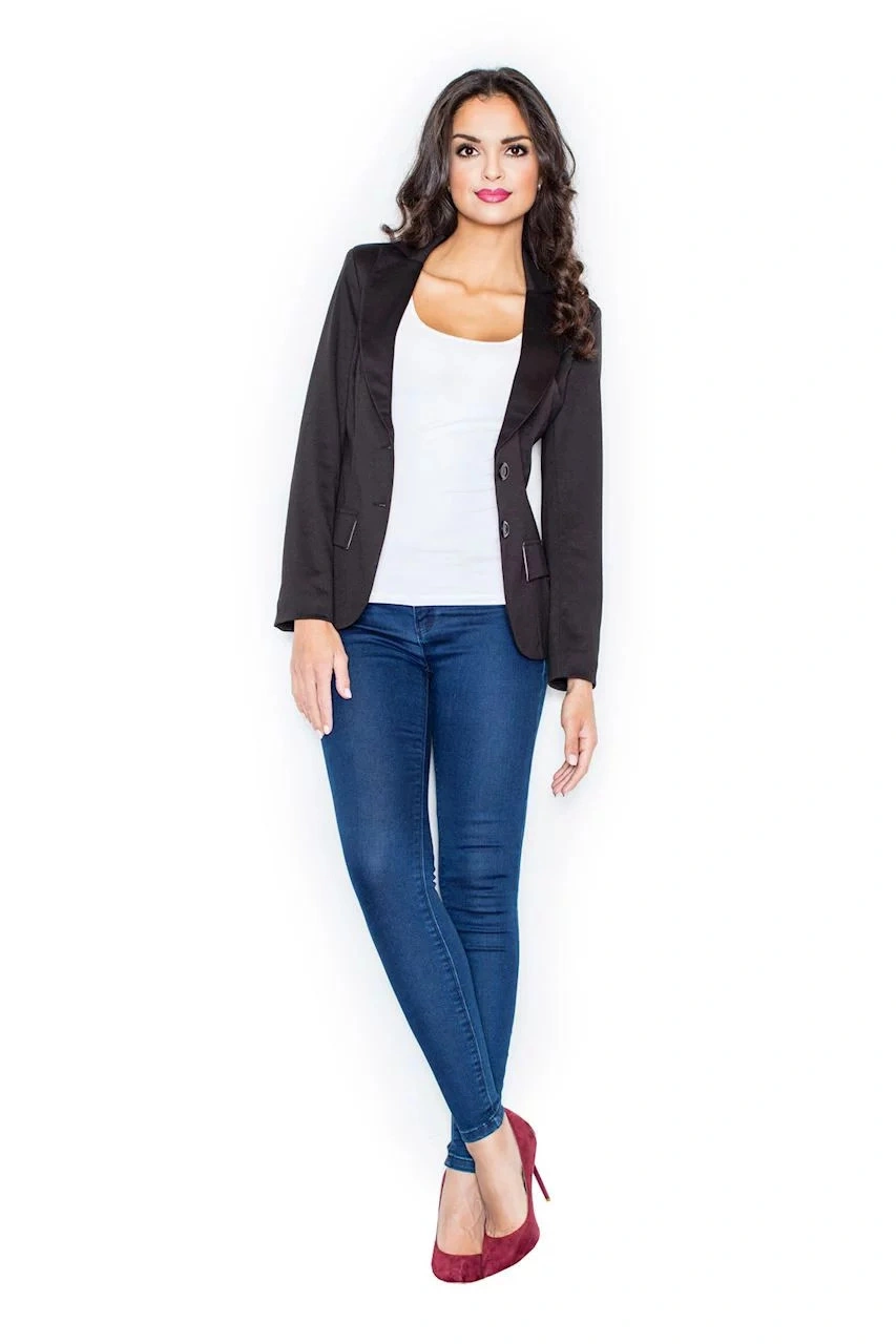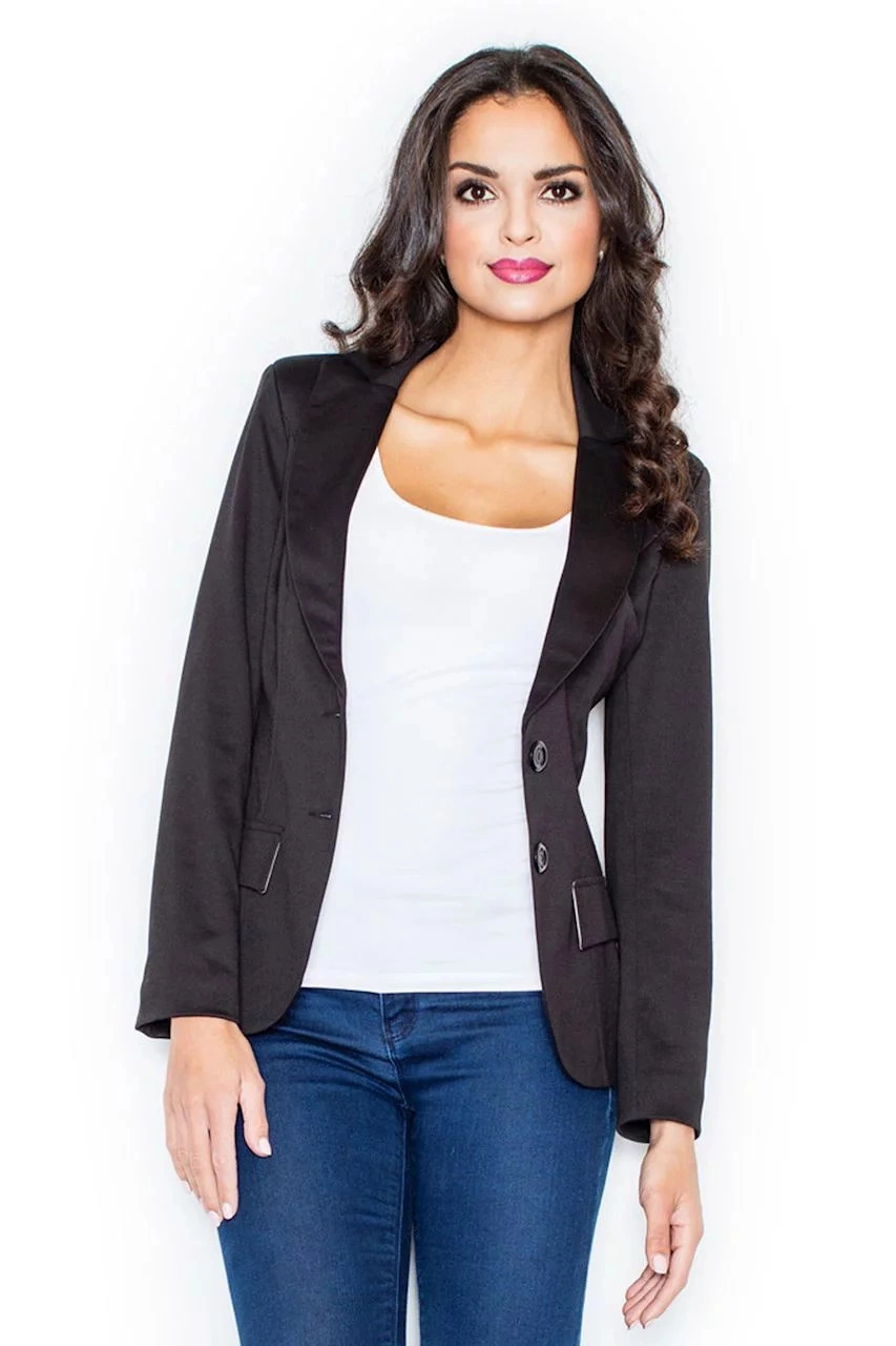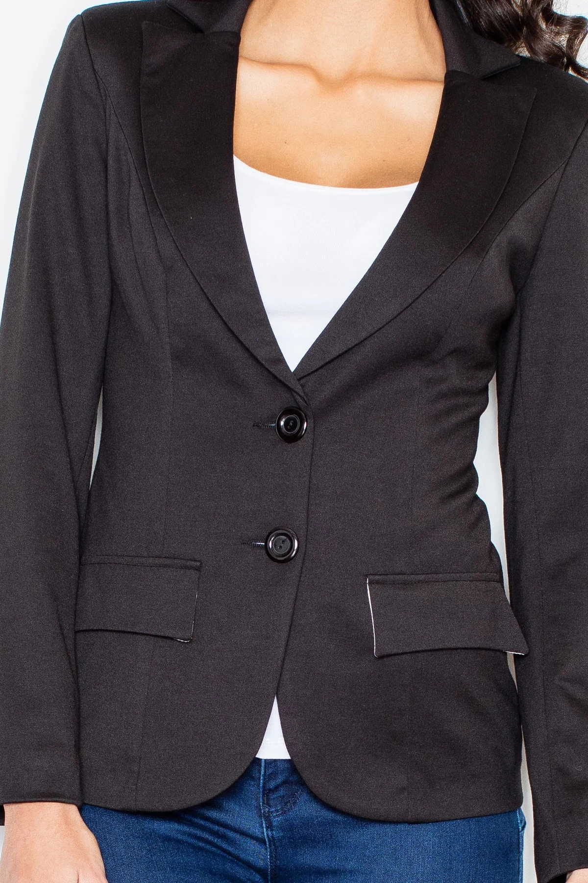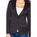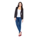 Damska miękka kurtka z długimi rękawami, długość do bioder. Podszewka. Zapięcie na dwa guziki. Naszywane klapy z przodu - imitacja kieszeni.