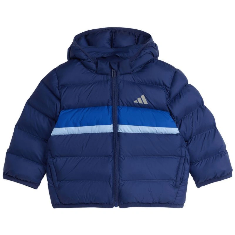 Kurtka dla dzieci adidas Synthetic Down granatowa JL7392 Kurtka dla dzieci adidas sprawdzi się w zimowe dni. Standardowy krój. Syntetyczne wypełnienie rozłożone w poziomych panelach w połączeniu z technologią Climawarm otula ciało ciepłem, jednocześnie oferując odprowadzenie nadmiaru wilgoci. Zamek na dalej długości. Nieodpinany kaptur bez regulacji. Wewnętrzna metka z imieniem pozwala spersonalizować kurtkę dla Twojego malucha. Materiał: 100% poliester z recyklingu