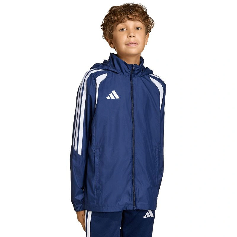 Kurtka dla dzieci adidas Tiro 26 League granatowa JY9725 Kurtka dla dzieci adidas pochodzi z linii Tiro. Podszewka z siateczki. System Clima365. Zamek na całej długości. Patka chroniąca podbródek. Nieodpinany kaptur bez regulacji. Dwie, zapinane kieszenie boczne. Standardowy krój. Mankiety wykończone ściągaczami. Dane techniczne:· Materiał: 100% poliester (pochodzący z recyklingu)· Standardowe dopasowanie· Kieszenie na suwaki· Podszewka z siateczki· Nieodpinany kaptur· Elastyczne mankiety