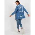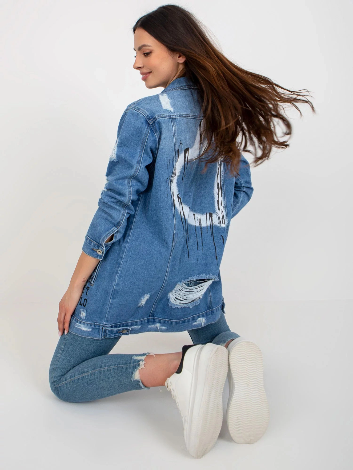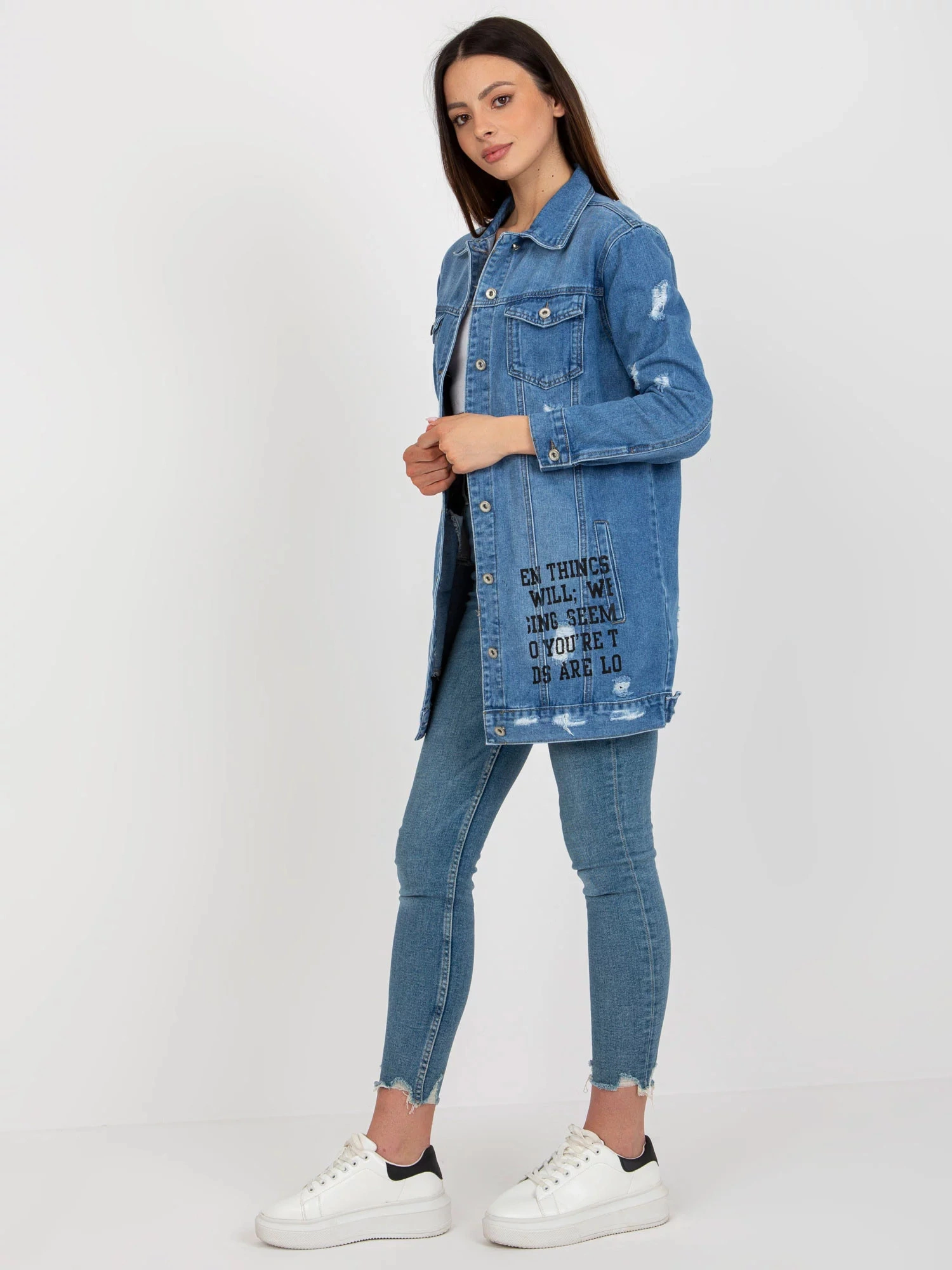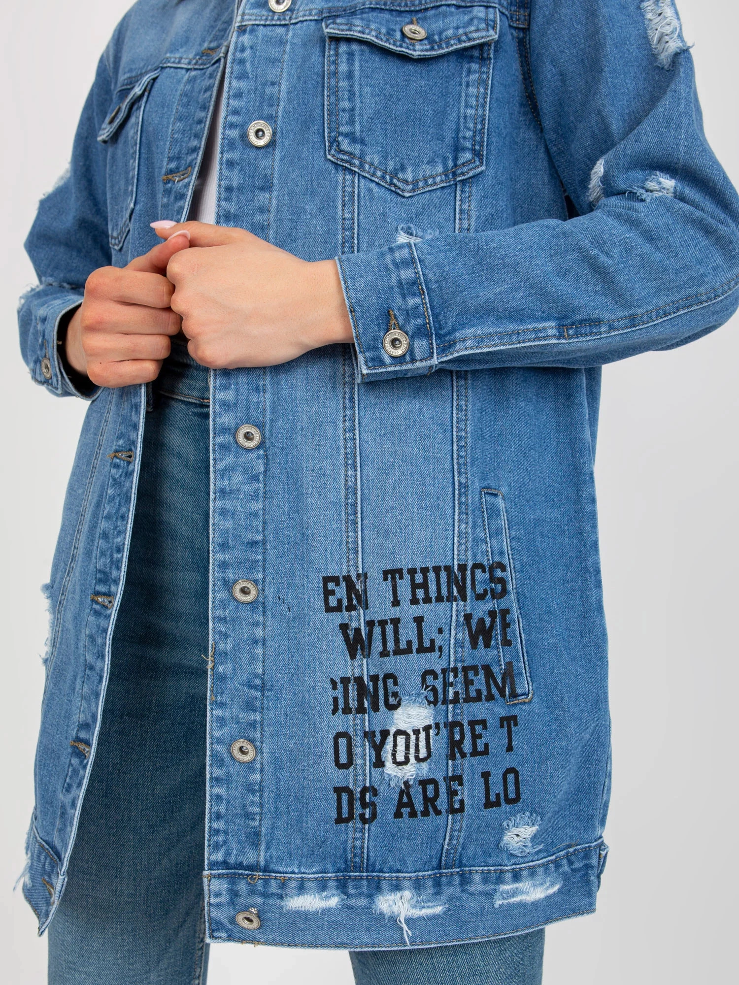 Niebieska długa kurtka dżinsowa z nadrukiem.