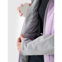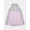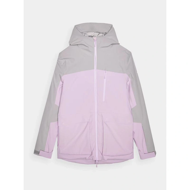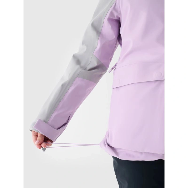 Damska kurtka narciarska z membraną jest wyposażona w zintegrowany kaptur z profilowanym daszkiem oraz regulacją głębokości. Szyję osłania wysoki kołnierz, który dodatkowo zabezpieczy przed chłodem i wiatrem. Rękawy zakończone są mankietami z regulacją na rzep. Pod pachami umieszczono wentylację zapinaną na jednokierunkowy zamek kryty pod plisą, który daje możliwość regulacji przepływu powietrza.Kurtka na narty damska jest zapinana na dwukierunkowy zamek główny z wewnętrzną plisą przeciwwiatrową, która ogranicza przenikanie chłodu do wnętrza kurtki. Obwód dołu można wyregulować przy użyciu tunelowego ściągacza ze stoperami. Całości dopełnia zintegrowany pas śnieżny z regulacją obwodu za pomocą nap, który zabezpiecza przed przedostawaniem się śniegu do wnętrza.