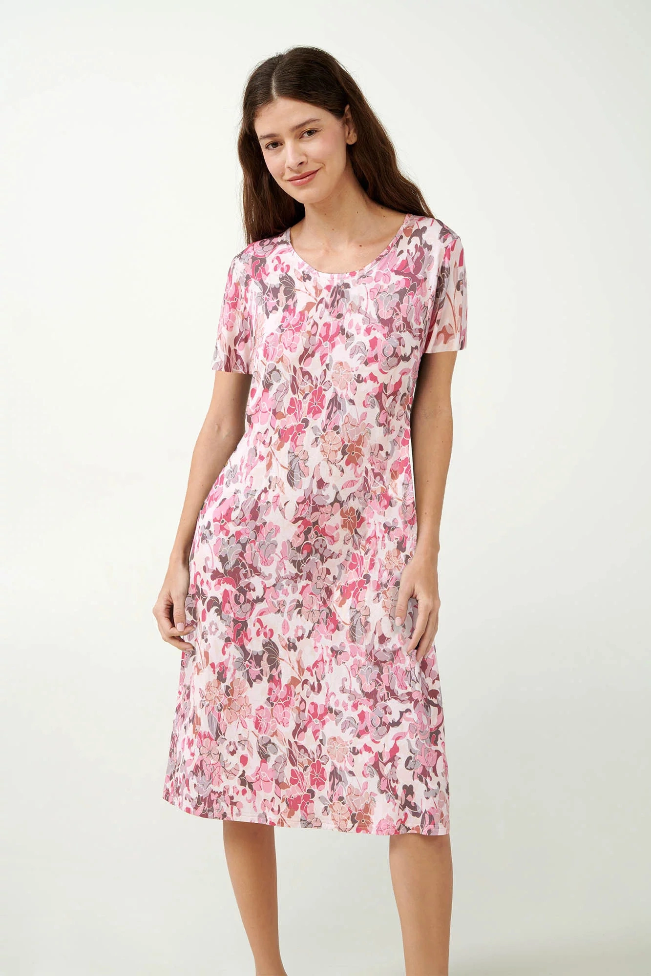 Ta kwiecista koszula nocna w delikatnym różowym kolorze łączy w sobie elegancję i wygodę. Tkanina wykonana jest z wysokiej jakości mikromodalu, który jest luksusowo miękki i oddychający na skórze, dzięki czemu idealnie nadaje się do spokojnego snu. Kwiatowy wzór dodaje kobiecości, a luźny krój zapewnia swobodę ruchów i wygodę. Idealna do odpoczynku lub spania, ta koszula nocna jest pięknym dodatkiem do Twojej kolekcji bielizny nocnej.