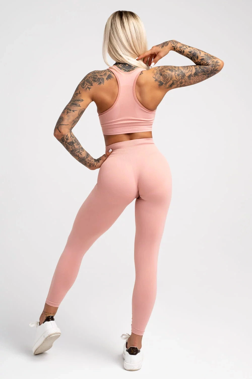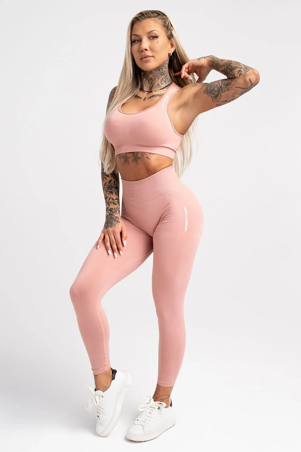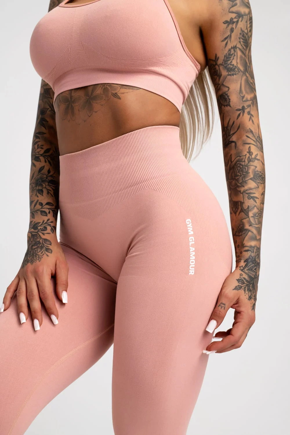 Bezszwowe legginsy kompresyjne z kolekcji 2022 Less Is More. Legginsy maskują niedoskonałości, są idealne dla każdego typu sylwetki. Zarówno dla umięśnionych kobiet, jak i dla tych, które nie ćwiczą. Materiał jest mocny, elastyczny i mięsisty. Jest to produkt wykonany z najmocniejszego materiału w naszej ofercie. Świetnie napina i modeluje sylwetkę, a przy tym nie uciska i nie powoduje dyskomfortu podczas intensywnych ćwiczeń. Taśma jest mocna i stabilna. Doskonale podtrzymuje brzuch, zwęża talię i zapewnia komfort podczas ćwiczeń. Nowe logo - napis Gym Glamour z boku, wykonany z ulepszonej folii. Nieprzezroczysty. Nawet przy ciężkim treningu nie widać śladów potu. brak pyłków, włosów itp. Idealne nie tylko do treningu, ale także do noszenia na co dzień. Ukryty, mały klin (wstawka w kroku).