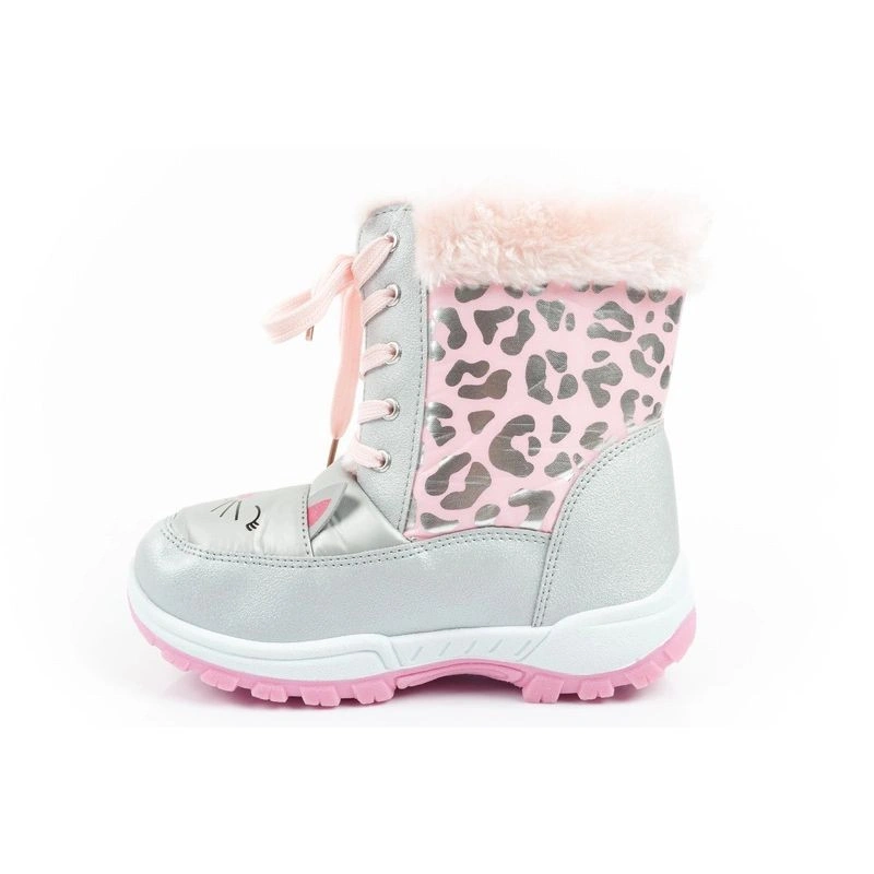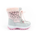 Cholewka została ozdobiona modnym, różowo-szarym wzorem przypominającym panterkę, a miękki, puszysty kożuszek wewnątrz zapewnia doskonałe ocieplenie w zimowe dni.