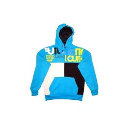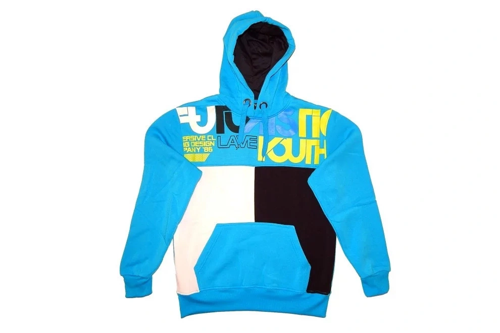Męska bluza z grubej bawełny. Kaptur jest podszyty kontrastowym materiałem. Bluza jest wyposażona w przednią kieszeń. W dolnej części bluzy znajduje się szeroki elastyczny ściągacz, dzięki któremu bluza nie wydostaje się na zewnątrz. Bluza składa się z kilku kolorowych części.kaptur tej bluzy jest ściągany sznurkiem z grubego materiału. Bluza jest ciepła, idealna na chłodniejsze miesiące roku (jesień, zima, wiosna).