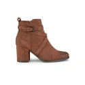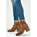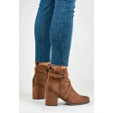 Botki wykonane z ekologicznej skóry zamszowej. Zapinane na zamek błyskawiczny po wewnętrznej stronie. Osadzone na średniej wysokości słupku. Ozdobne skrzyżowane paski z metalową sprzączką wokół kostki. Lekko ocieplane po wewnętrznej stronie. Wygodne, klasyczne i bardzo eleganckie botki uzupełnią wiele jesiennych stylizacji.
