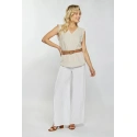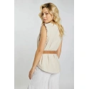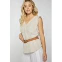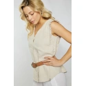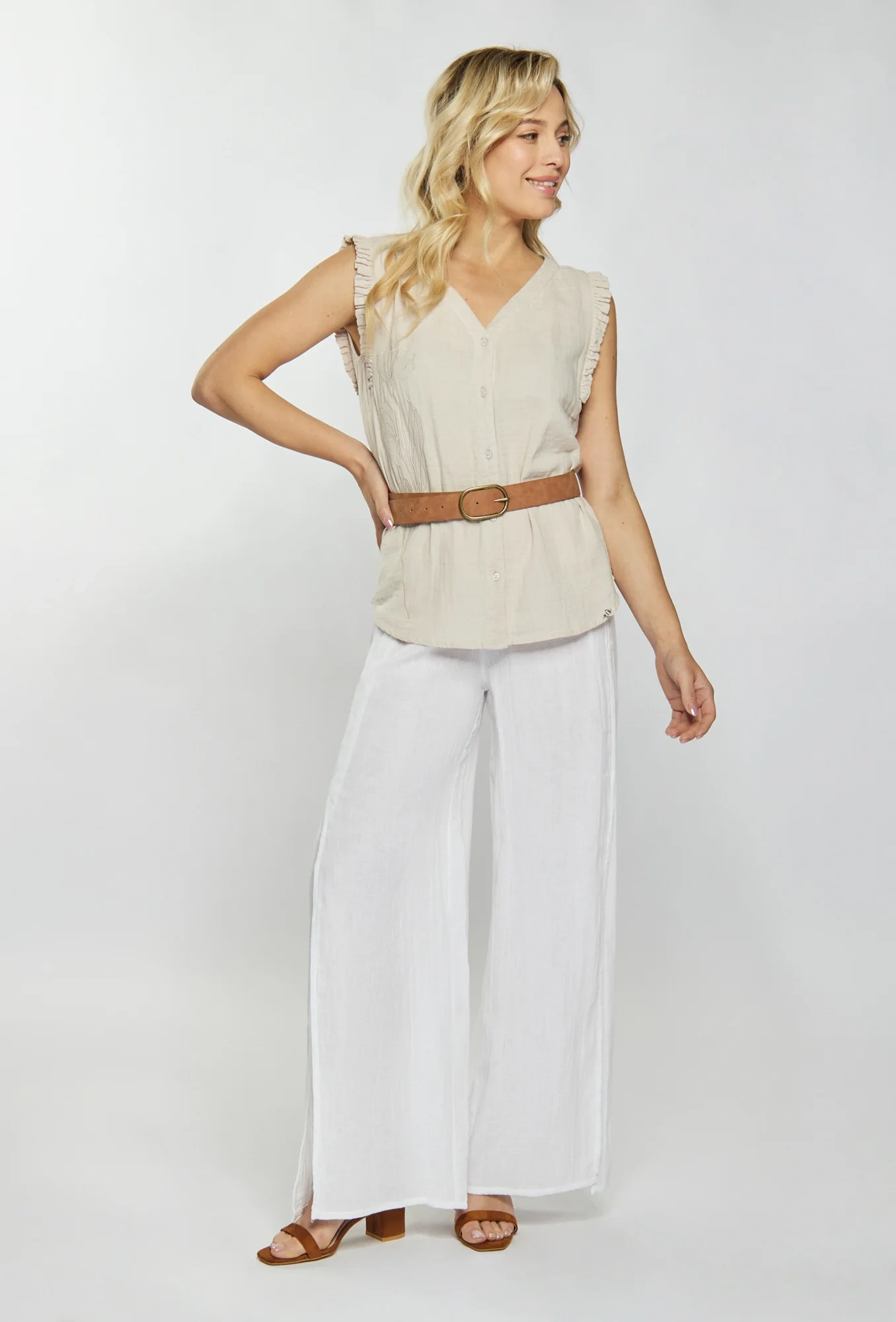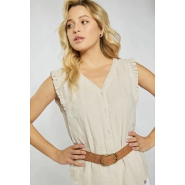 Damska bluzka muślinowa wykonana z miękkiej tkaniny bawełnianej. Bluzka wisiała na szerokich ramiączkach z falbanami i dekoltem w kształcie litery V. Bluzka jest zapinana na guziki. Model ten świetnie sprawdzi się w niemal każdej stylizacji. Modelka na zdjęciu ma 177 cm wzrostu i nosi rozmiar 36.