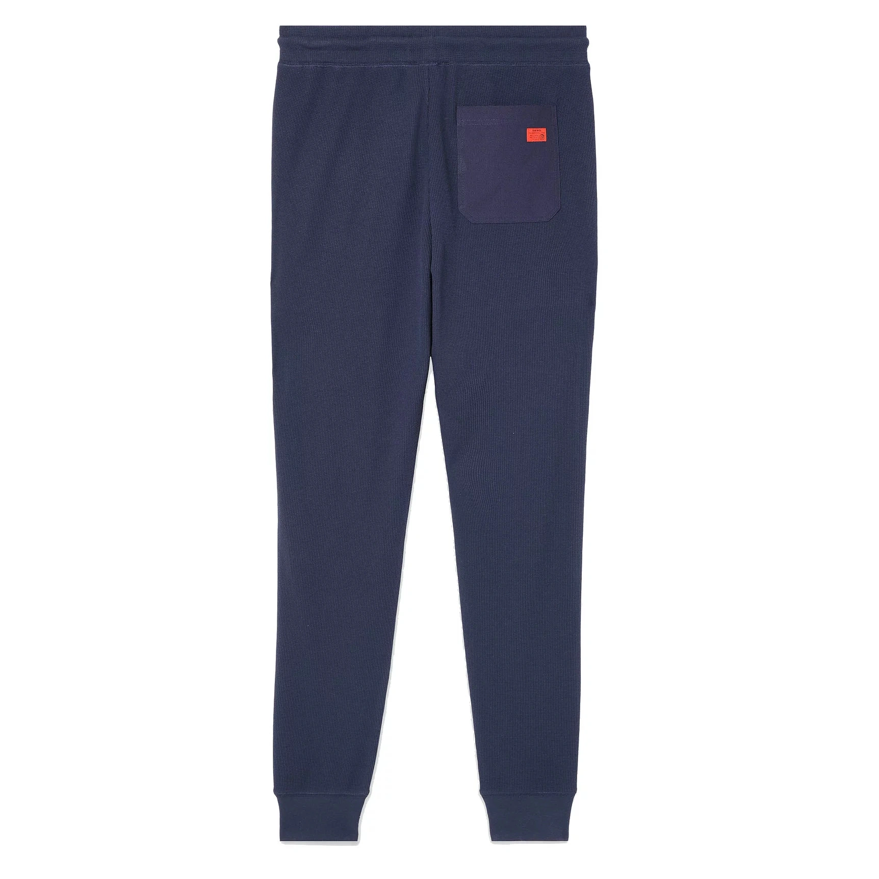 Męskie spodnie dresowe wykonane z dzianinowej, elastycznej mieszanki bawełny organicznej i poliestru pochodzącego z recyklingu. Posiadają przednie kieszenie do wygodnego przechowywania drobiazgów oraz tylną kieszeń. Spodnie dresowe zapinane są na krawat, co pozwala na wygodne dopasowanie i regulację szerokości w pasie.