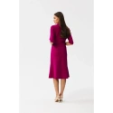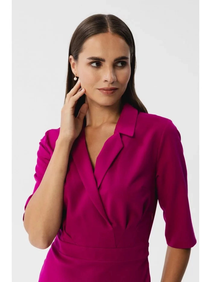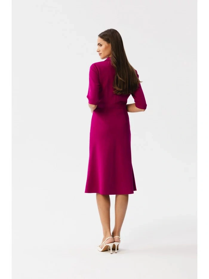 SZCZEGÓŁY PRODUKTU: tkana sukienka z kołnierzykiem długość poniżej kolan spódnica o skośnym kroju rękawy 3/4 ukryty zamek błyskawiczny z tyłu bez podszewki Modelka ma 174 cm wzrostu i nosi rozmiar S. Zaprojektowano i wykonano w Polsce