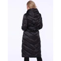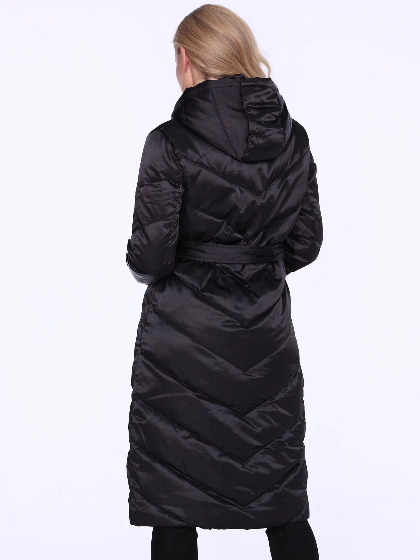 Wiązany długi damski płaszcz puchowy to ponadczasowy element, który nigdy się nie znudzi i nigdy nie wyjdzie z mody. Głęboka czerń z lekkim połyskiem to pozycja obowiązkowa dla każdego miłośnika klasycznego designu. Wiązanie pozwala pięknie podkreślić kobiecą sylwetkę, a wypełnienie z pierza zapewnia ciepło podczas zimowej aury.