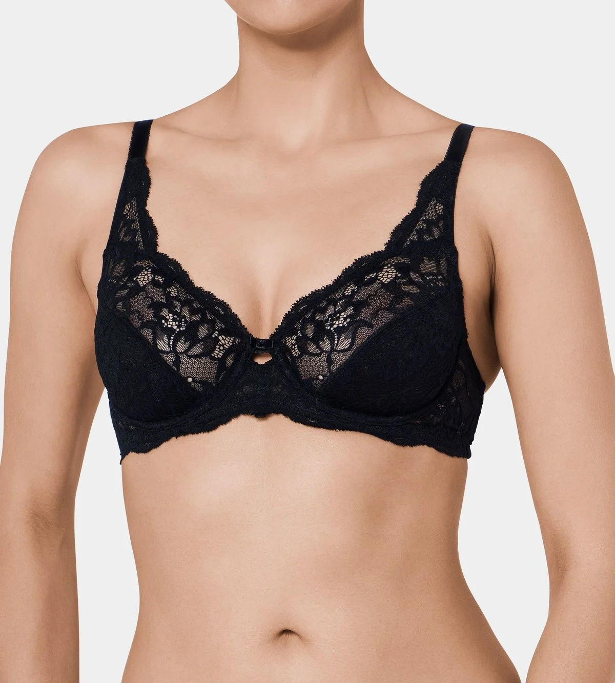 Piękny model miękkiego biustonosza wykonanego z koronkowego materiału. Miseczki i ich środek są ozdo
