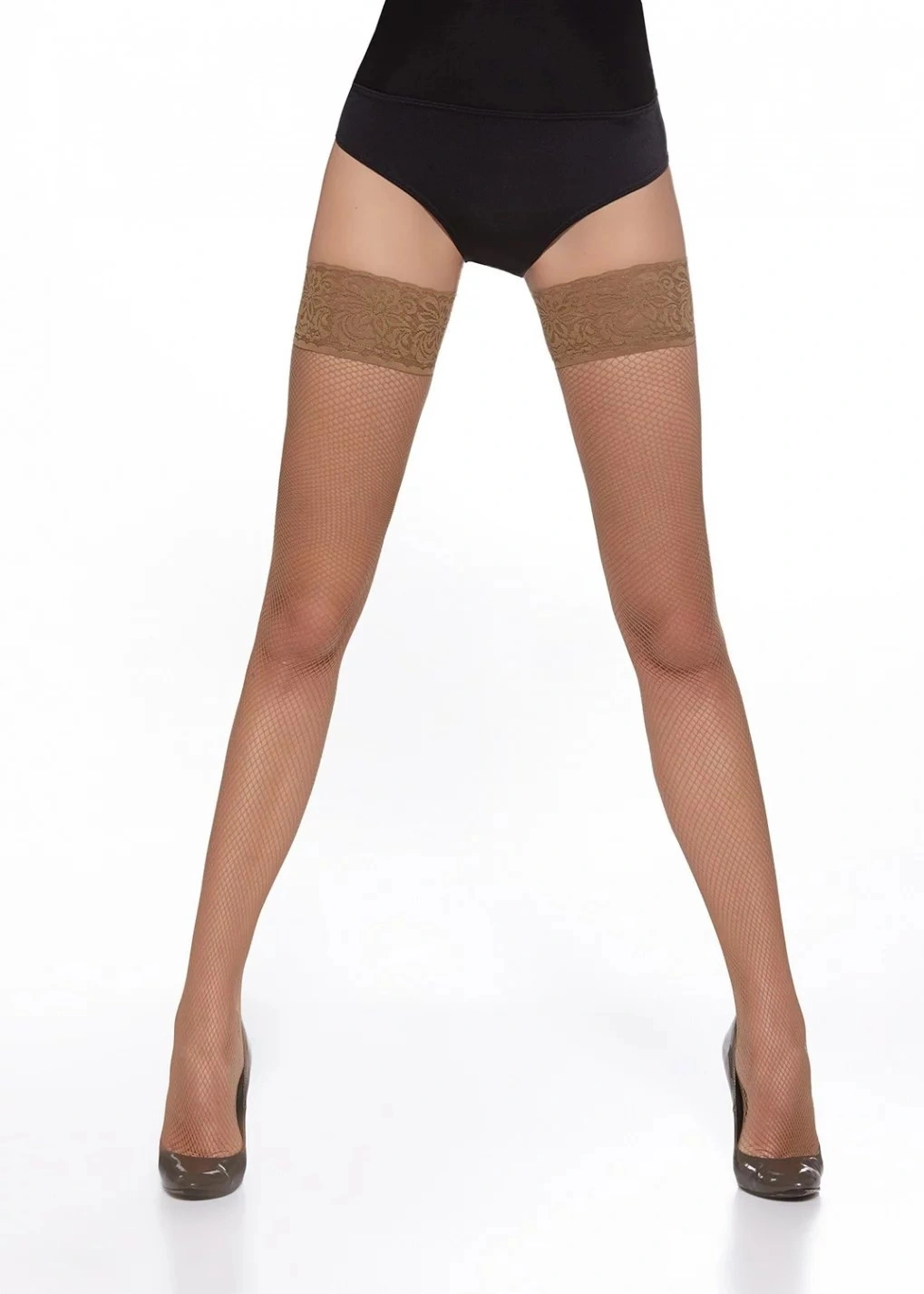 Samodržící punčochy kabaretky, s malými oky, zakončené dekorativní krajkou na silikonu, bez zpevnění