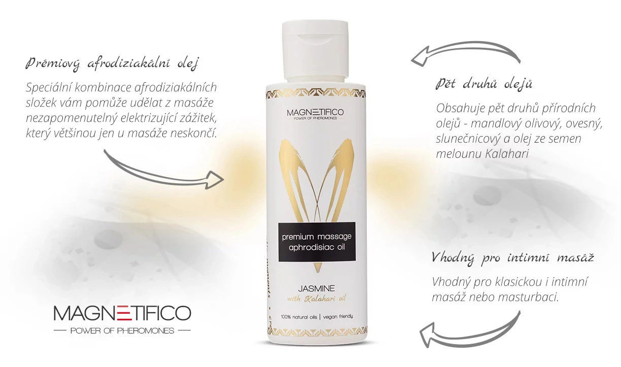 Nechte se hýčkat a prožijte nezapomenutelné chvíle plné vzrušení i relaxace. Tento masážní olej z řady MAGNETIFICO – power of pheromones byl navržen tak, aby zajistil optimální kluzkost a nebyl zároveň příliš mastný a přirozeně se tak vstřebal do pokožky. Speciální kombinace afrodiziakálních složek vám pomůže udělat z masáže nezapomenutelný elektrizující zážitek, který většinou jen u masáže neskončí.