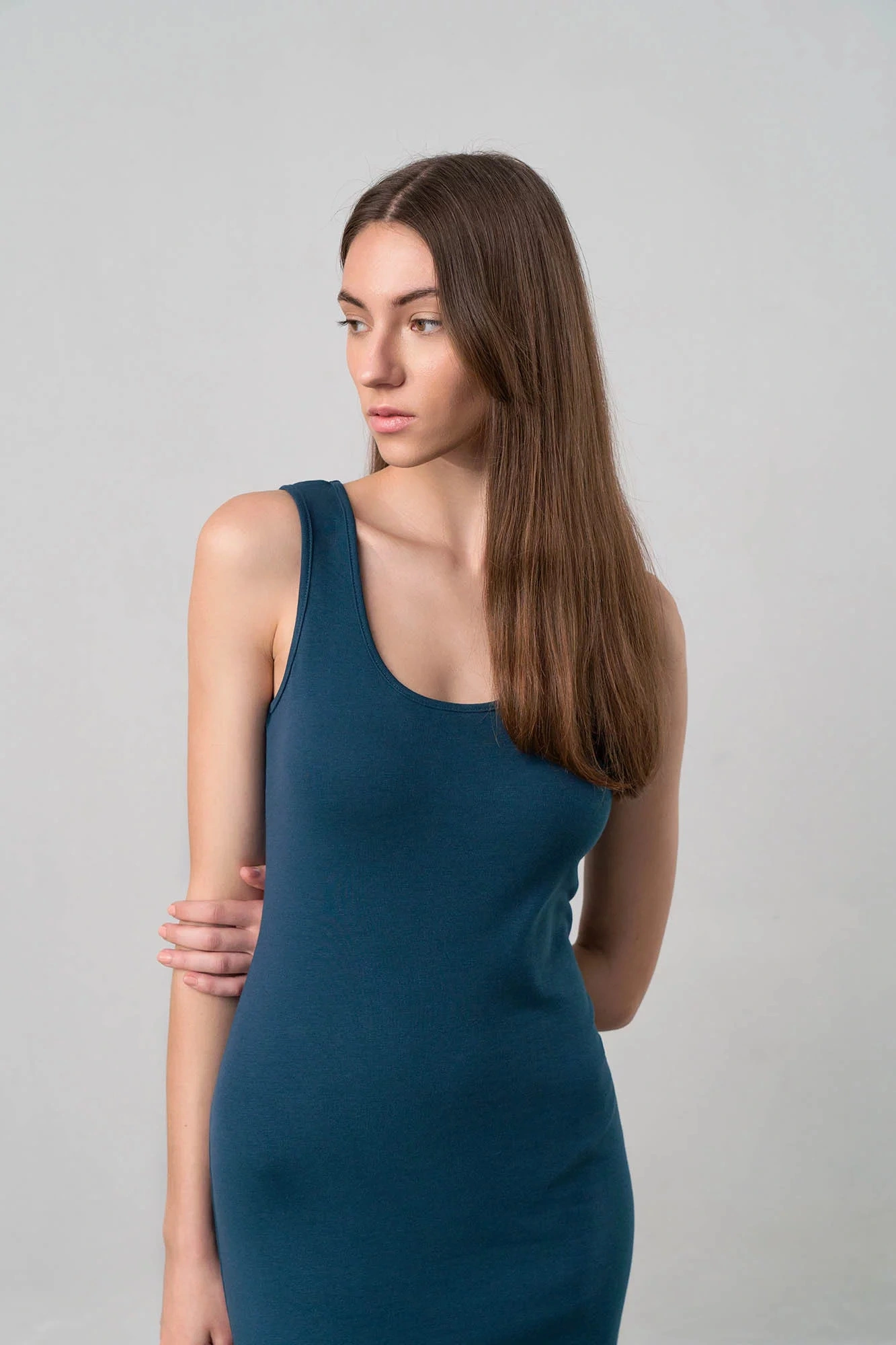 Dopasowany krój z głębokim dekoltem i elastyczną talią. Pokochasz tę miękką bawełnianą sukienkę o śr