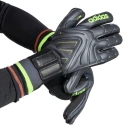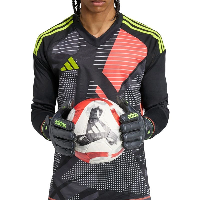 Rękawice bramkarskie adidas Copa Pro czarne JN5335 Rękawice bramkarskie adidas przeznaczone dla mężczyzn sprawdzą się w trakcie decydujących rozgrywek na boiskach z trawą naturalną. Przyczepna pianka URG 2.0 pochłania siłę uderzenia po wewnętrznej stronie dłoni. Tekstylne panele wspomagają naturalny proces wentylacji. Dane techniczne:· Część główna: 78% poliester pochodzący z recyklingu, 18% poliuretan, 4% elastan· Wewnętrzna część dłoni: URG 2.0, 100% lateks· Krój z wewnętrznymi szwami· Grzbiet dłoni z siateczki i lateksu· Przedłużony uchwyt z lateksu na kciuku· Elastyczny pasek w nadgarstku