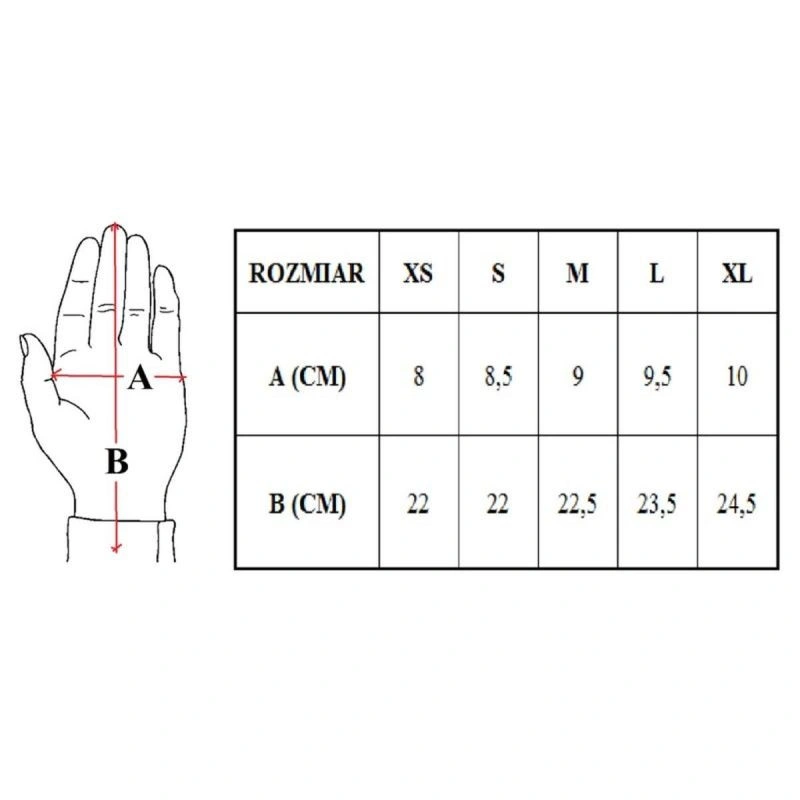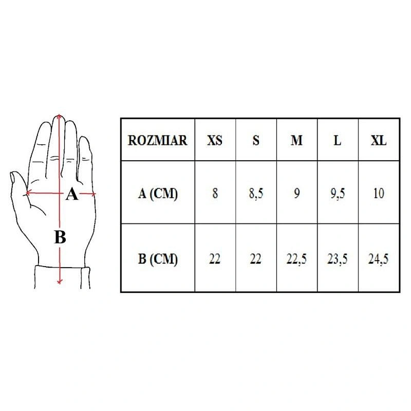 Rękawice dostępne są w rozmiarach XS, S, M, L, XL Poniżej tabela , która ułatwi Państwu dobór odpowiedniego rozmiaru