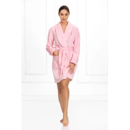 Cassidy to elegancki damski szlafrok w kolorze różowym. Ozdobne wykończenia dodają uroku. Model ma długie rękawy, kieszenie po bokach i wiązanie w talii. Krój ze stylowym kołnierzem (bez kaptura). Idealne opakowanie na prezent. Polski produkt. Wysoka jakość.