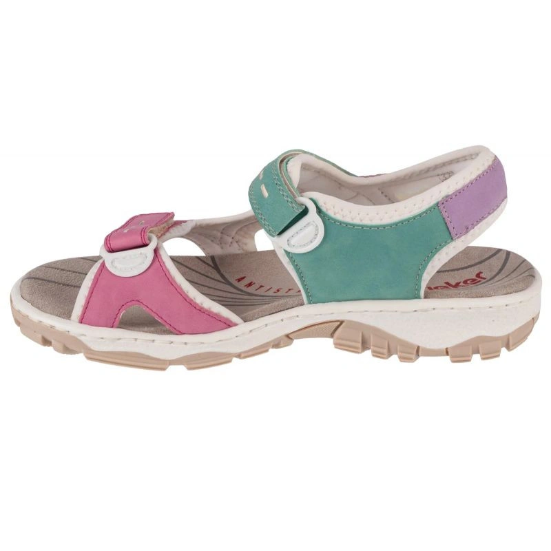 Właściwości: damskie sandały marki Rieker, doskonałe na letnie dni, otwarta konstrukcja, zapinane