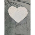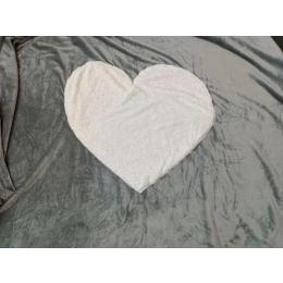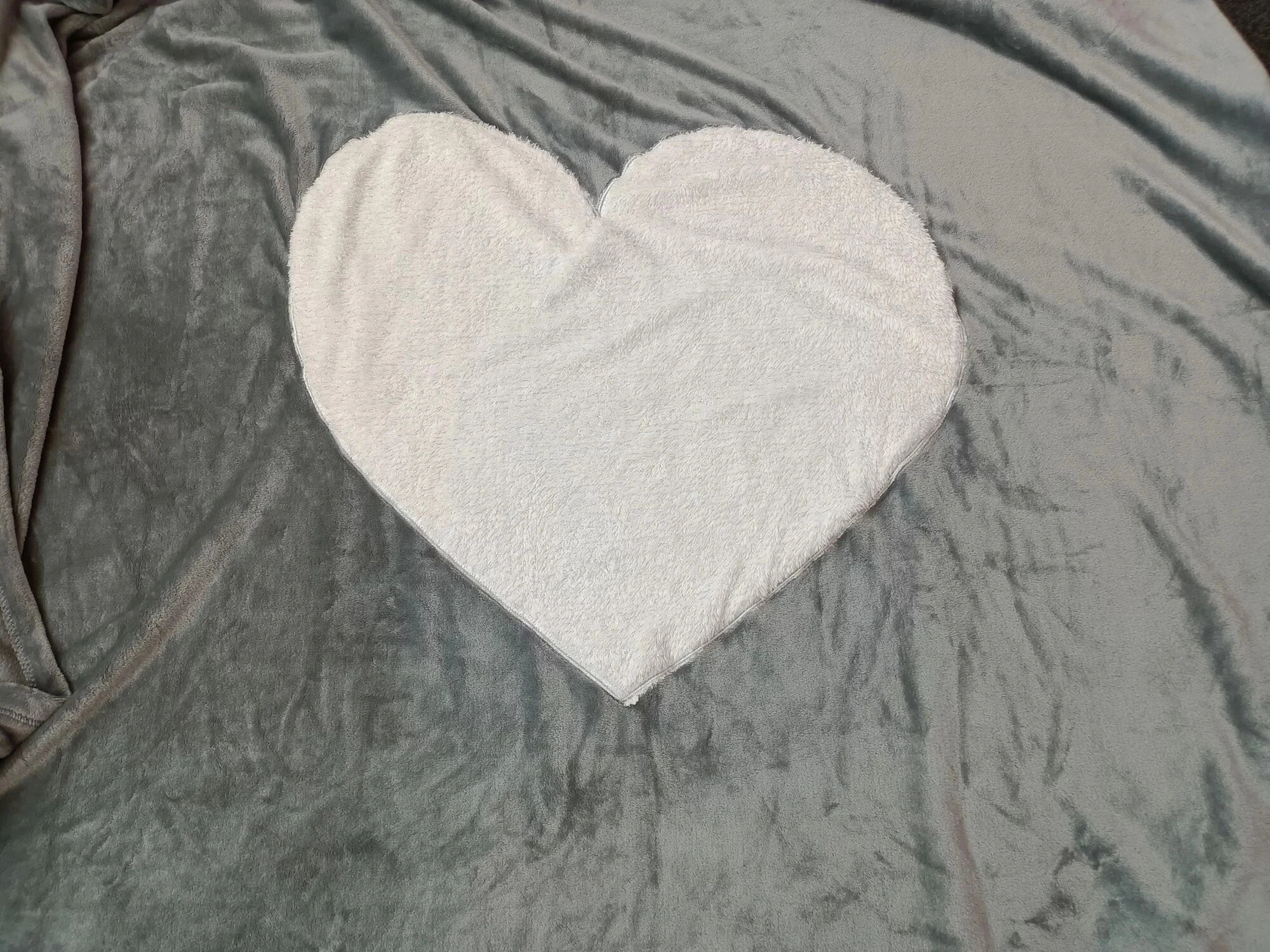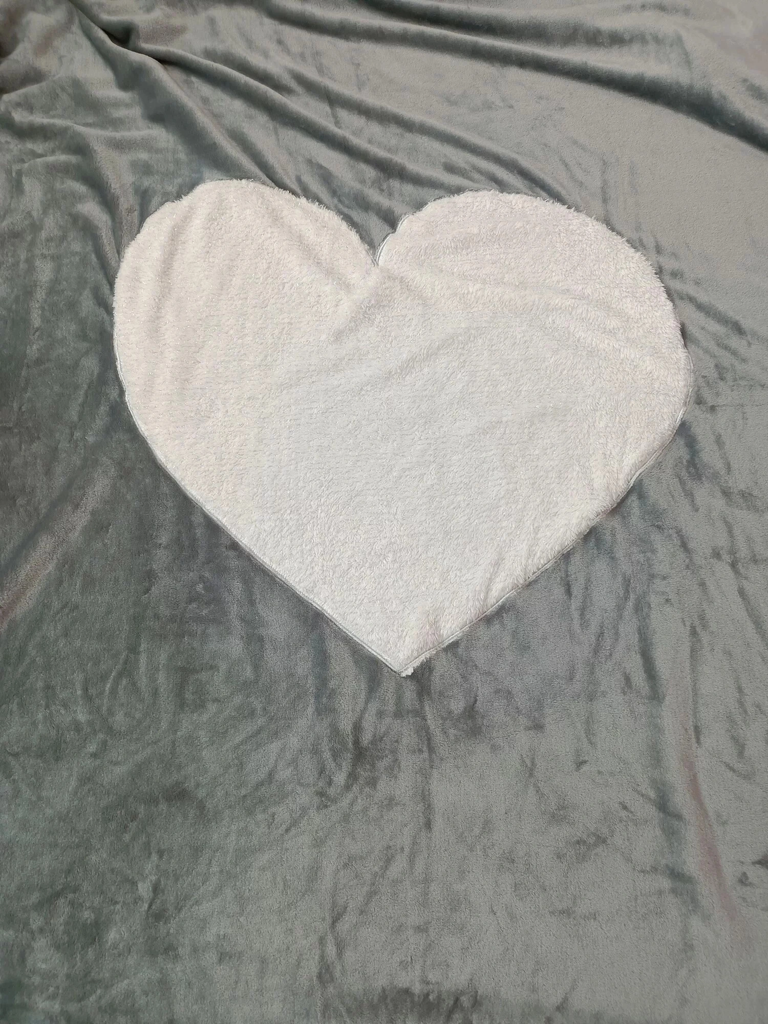 Šedá semišová deka s velkým všitým bílým srdcem uprostřed.
