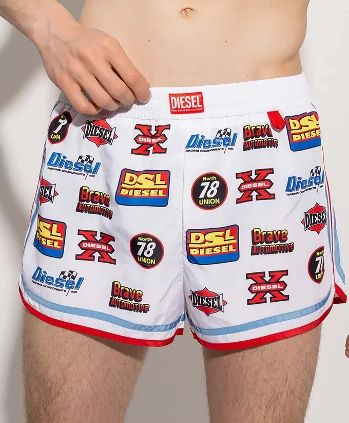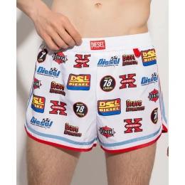 Białe szorty kąpielowe "Reef" marki Diesel. Ta para zapinana jest na sznurki i ma elastyczny pas, wielokolorowy nadruk z logo i kieszeń zapinaną na suwak.100% poliester