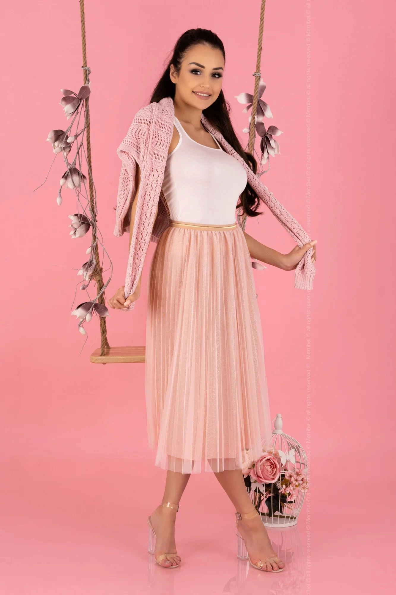 Jasnoróżowa wzorzysta spódnica BSL. 100% poliester metoda prania: pranie w pralce w temperaturze 3