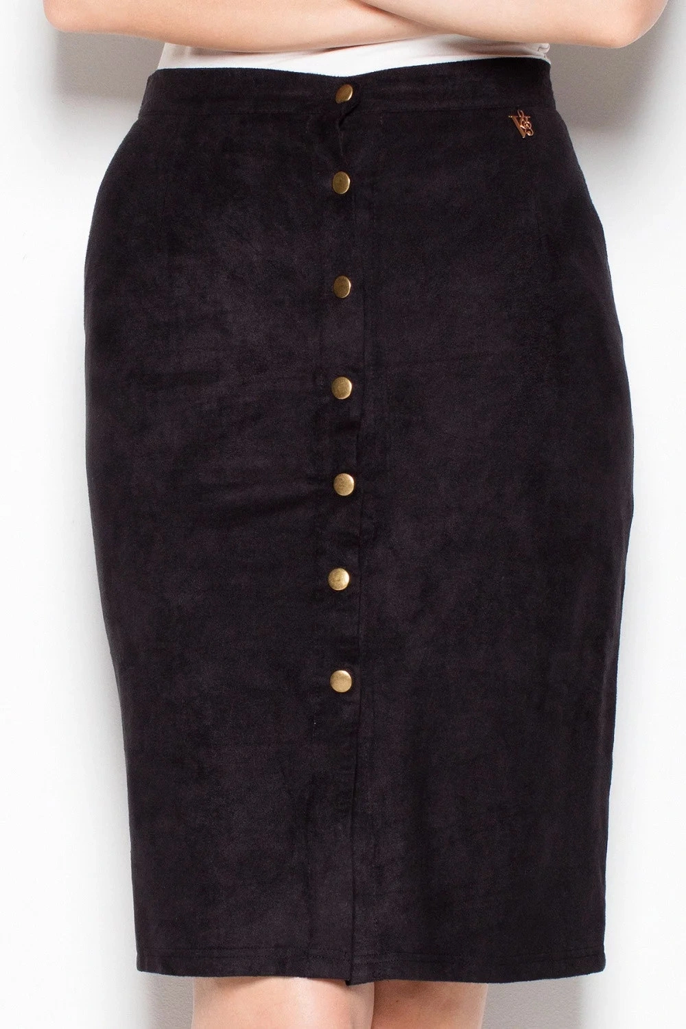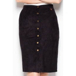 Modna ołówkowa spódnica o długości midi wykonana z zamszu. Charakterystyczną cechą spódnicy jest rząd ozdobnych guzików, które rozciągają się wzdłuż całej długości spódnicy.