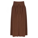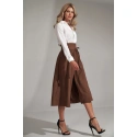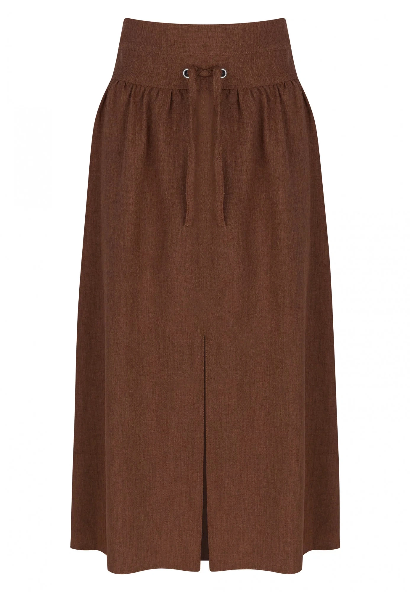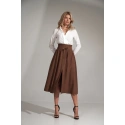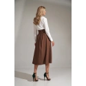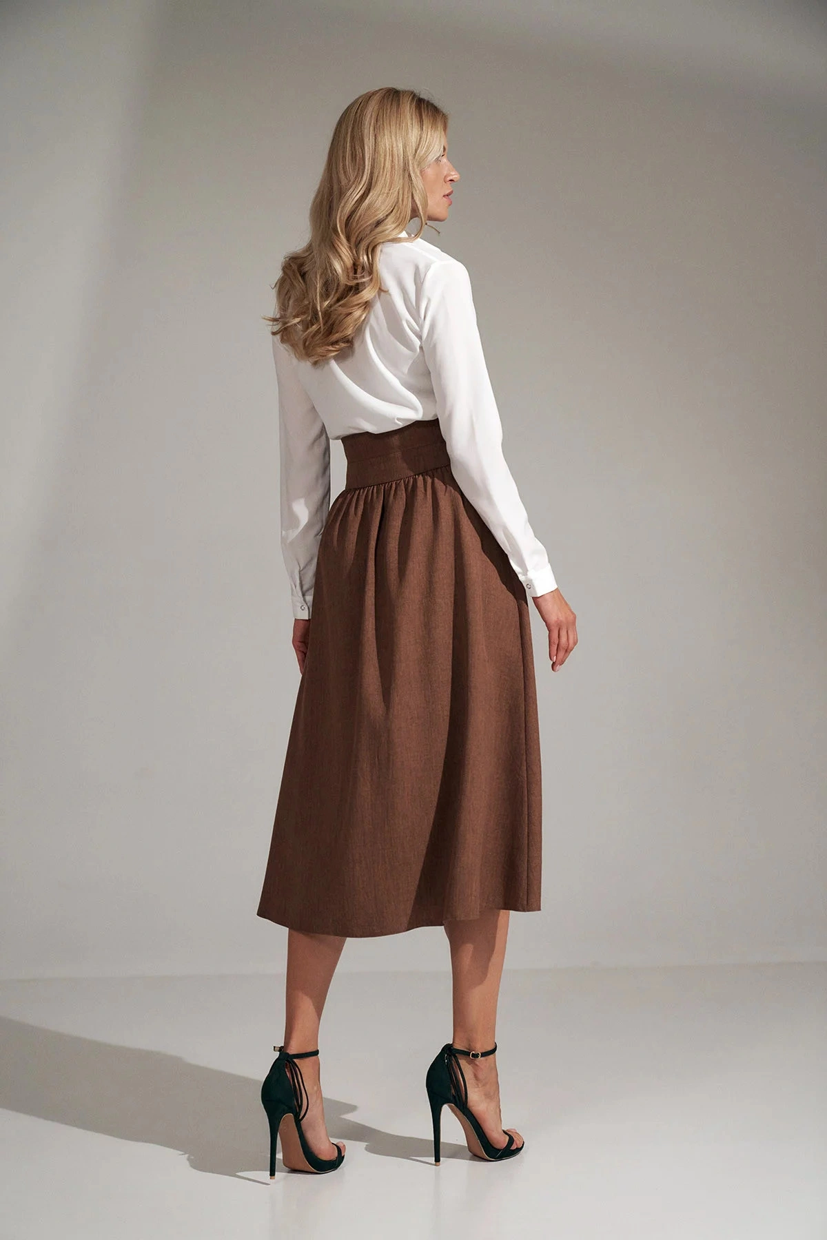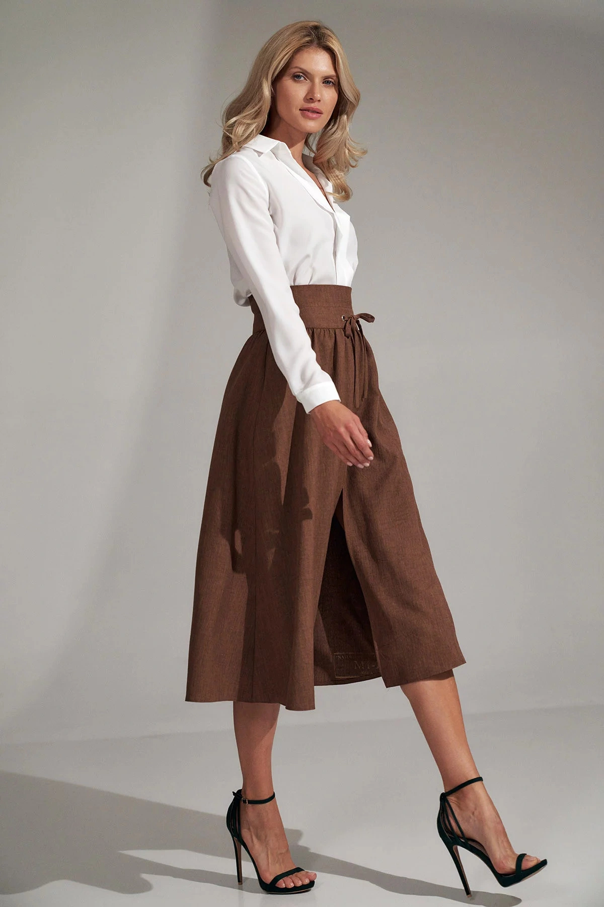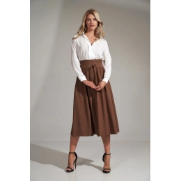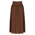 Brązowa długa, rozkloszowana spódnica, szeroki wysoki stan z ozdobnym wiązaniem, rozcięcie z przodu, bez kieszeni, kryty zamek błyskawiczny po lewej stronie, bez podszewki.