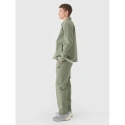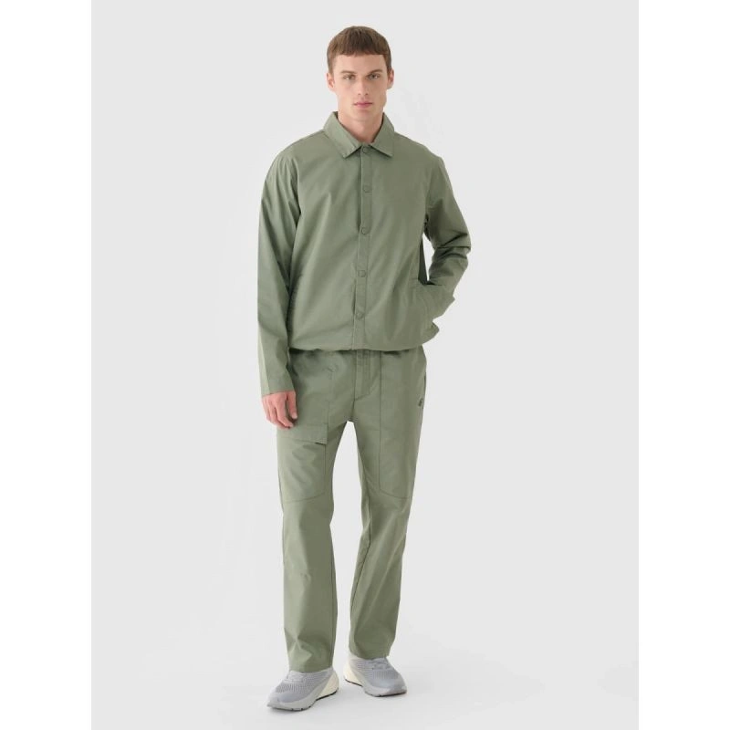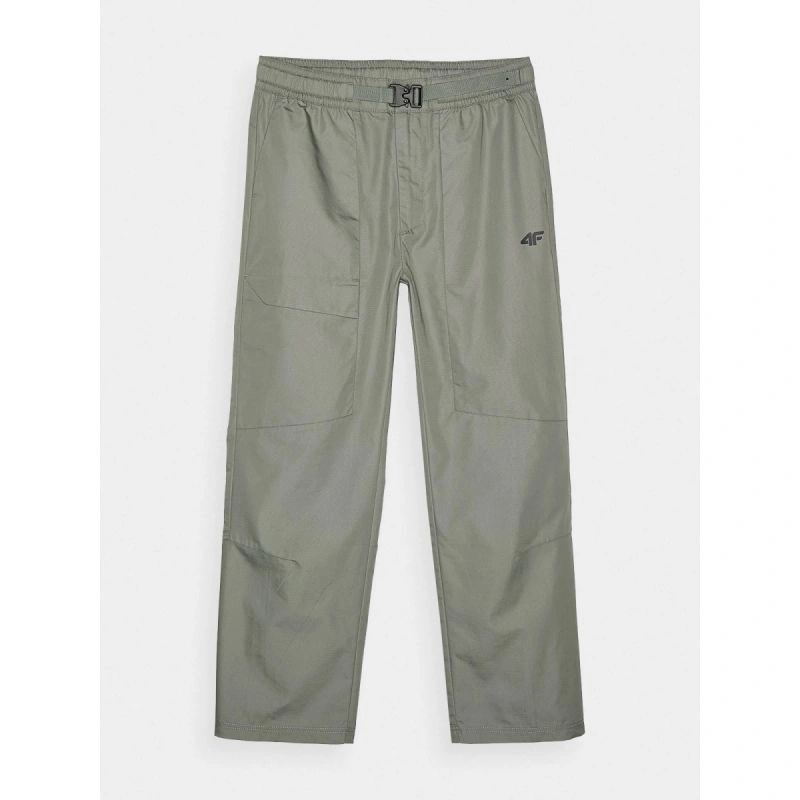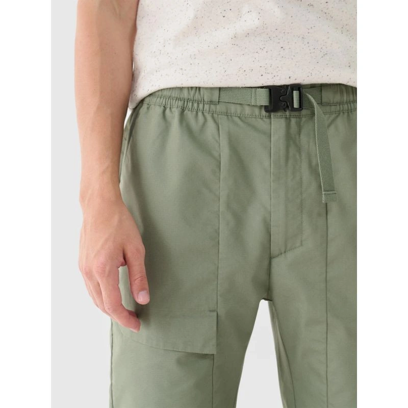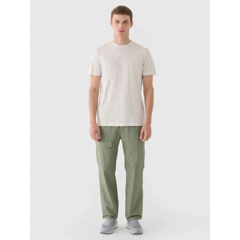 Męskie spodnie casual to uniwersalny wybór do codziennych stylizacji lifestylowych i sportowych, stworzony z myślą o wygodzie i funkcjonalności. Krój regular wygodnie dopasowuje się do sylwetki, a proste nogawki bez ściągacza i regulacji zapewniają klasyczny, ponadczasowy wygląd. Model został wykonany z naturalnej bawełny (72%), która jest miękka, trwała i przyjemna w dotyku, natomiast dodatek poliestru (28%) zwiększa odporność materiału na zużycie oraz pomaga zachować fason przez wiele sezonów. Brak podszycia sprawia, że spodnie są lżejsze i idealne na cieplejsze dni. Praktyczne rozwiązania, takie jak dwie otwarte kieszenie boczne oraz dodatkowa zapinana kieszeń na nogawce, ułatwiają przechowywanie drobiazgów. Elastyczny pas z dodatkowym paskiem zapinanym na klamrę z zatrzaskiem zapewnia stabilne i wygodne dopasowanie podczas codziennego użytkowania.