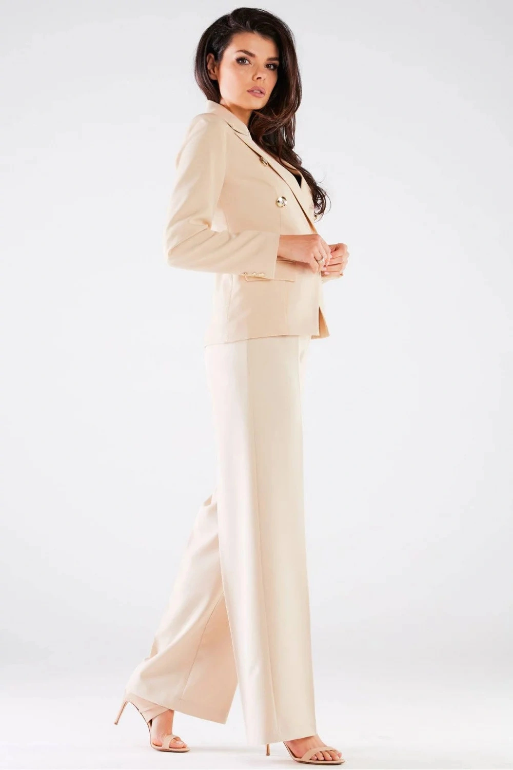 Spodnie z wysokim stanem i szerokimi nogawkami, bez kieszeni. Spodnie z zamkiem błyskawicznym i guzikiem z przodu. Świetnie wyglądają z kurtką w tym samym kolorze. Produkt wyprodukowany w Polsce.